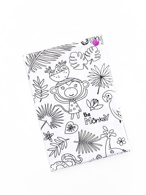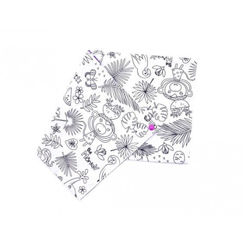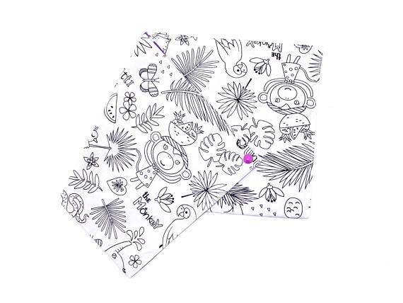 Recto imprimé jungle et verso violet petits pois blancs (cf photo 3 ): serviette ludique car elle peut être coloriée avec des feutres lavables pour répéter l'opération à volonté ou avec des feutres permanents résistants au lavage pour un motif définitif.