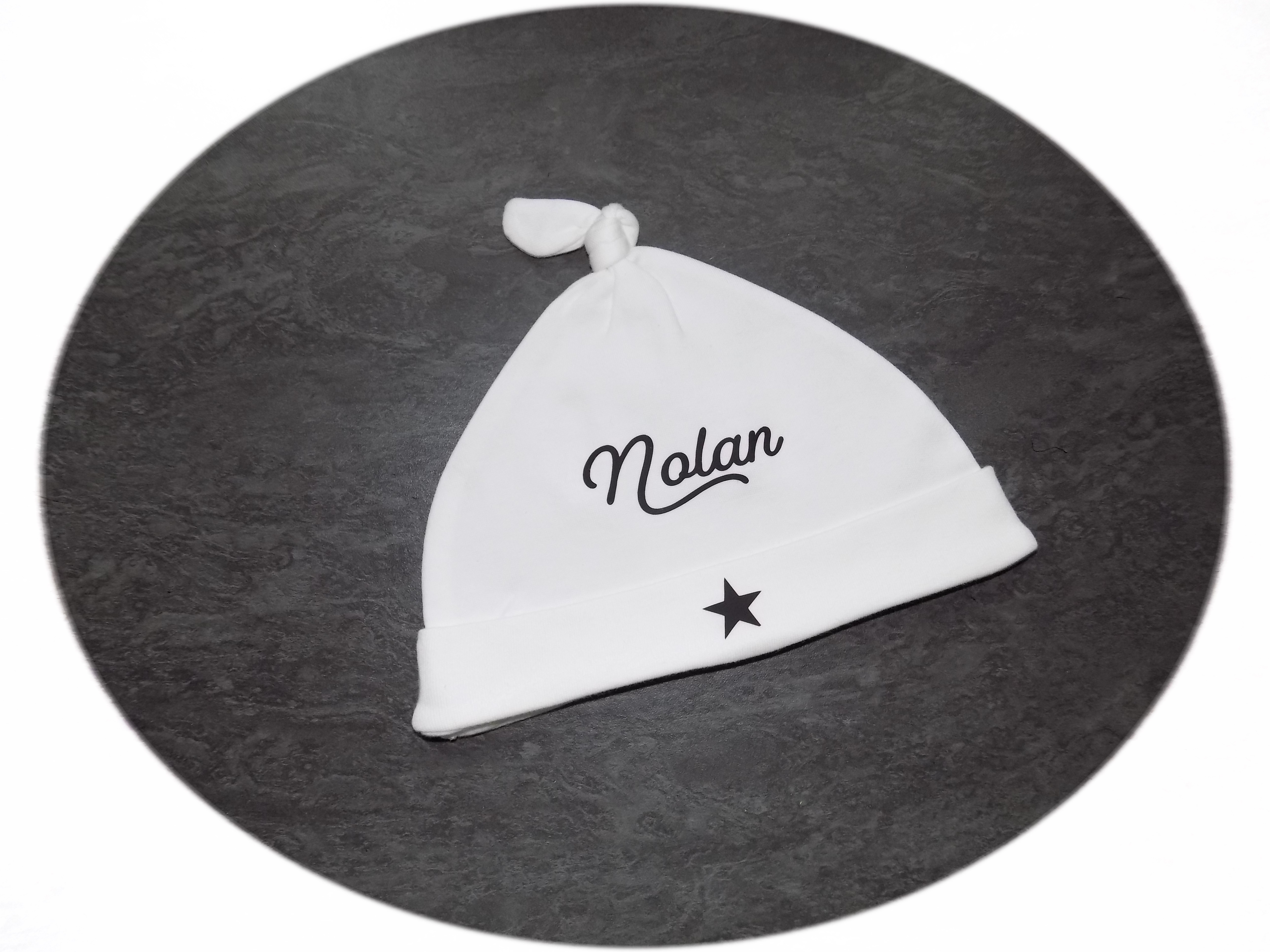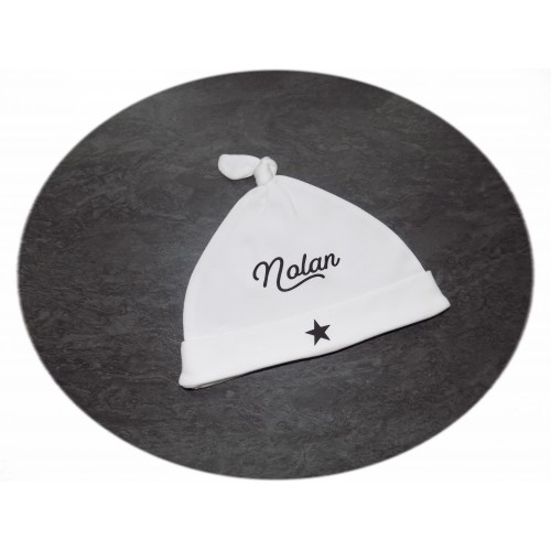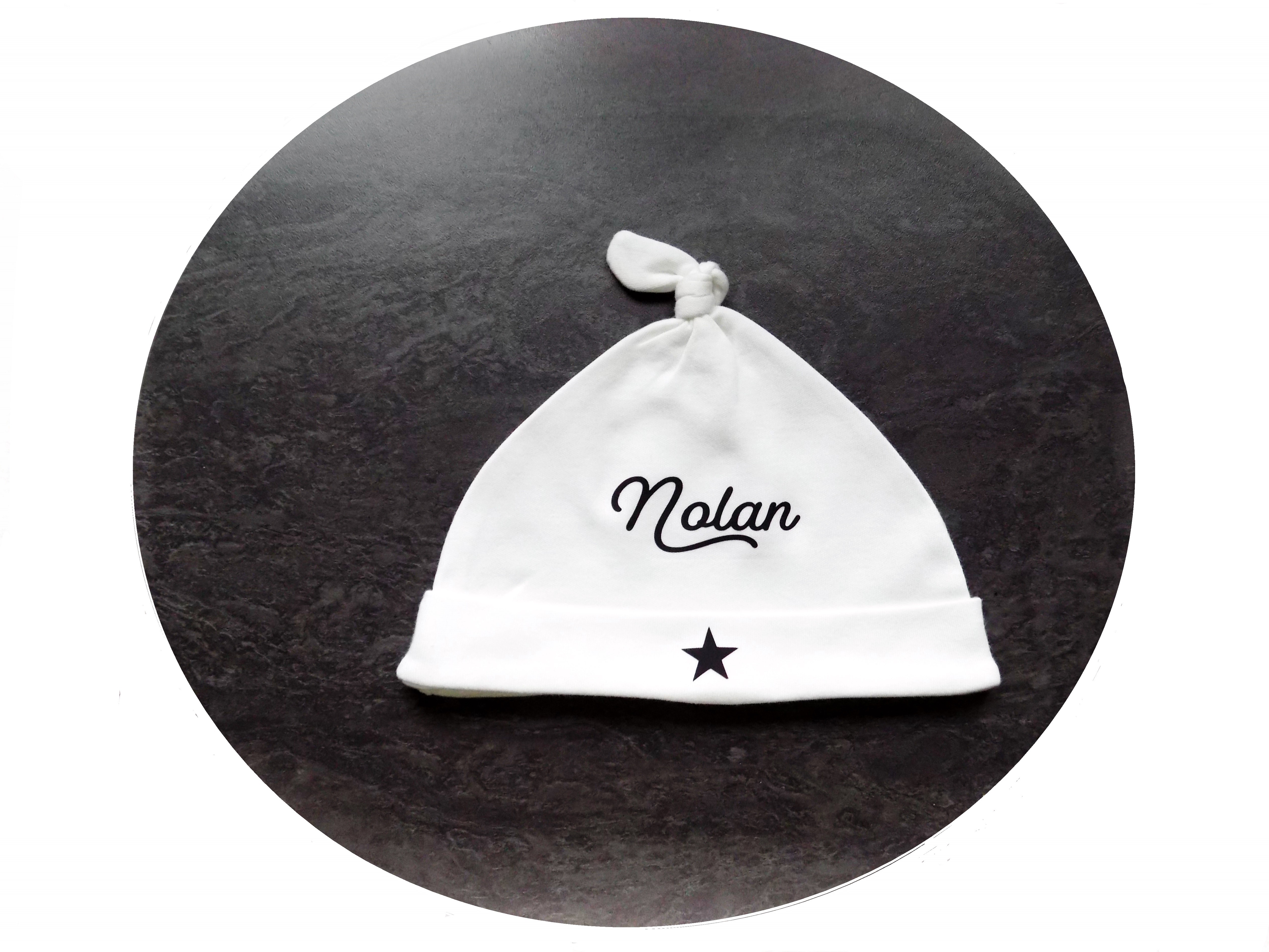 Ravissant bonnet en tissu coton Bio agrémenté d'une petite étoile et customisable avec le prénom de votre choix, ce modèle NOLAN est disponible de suite.