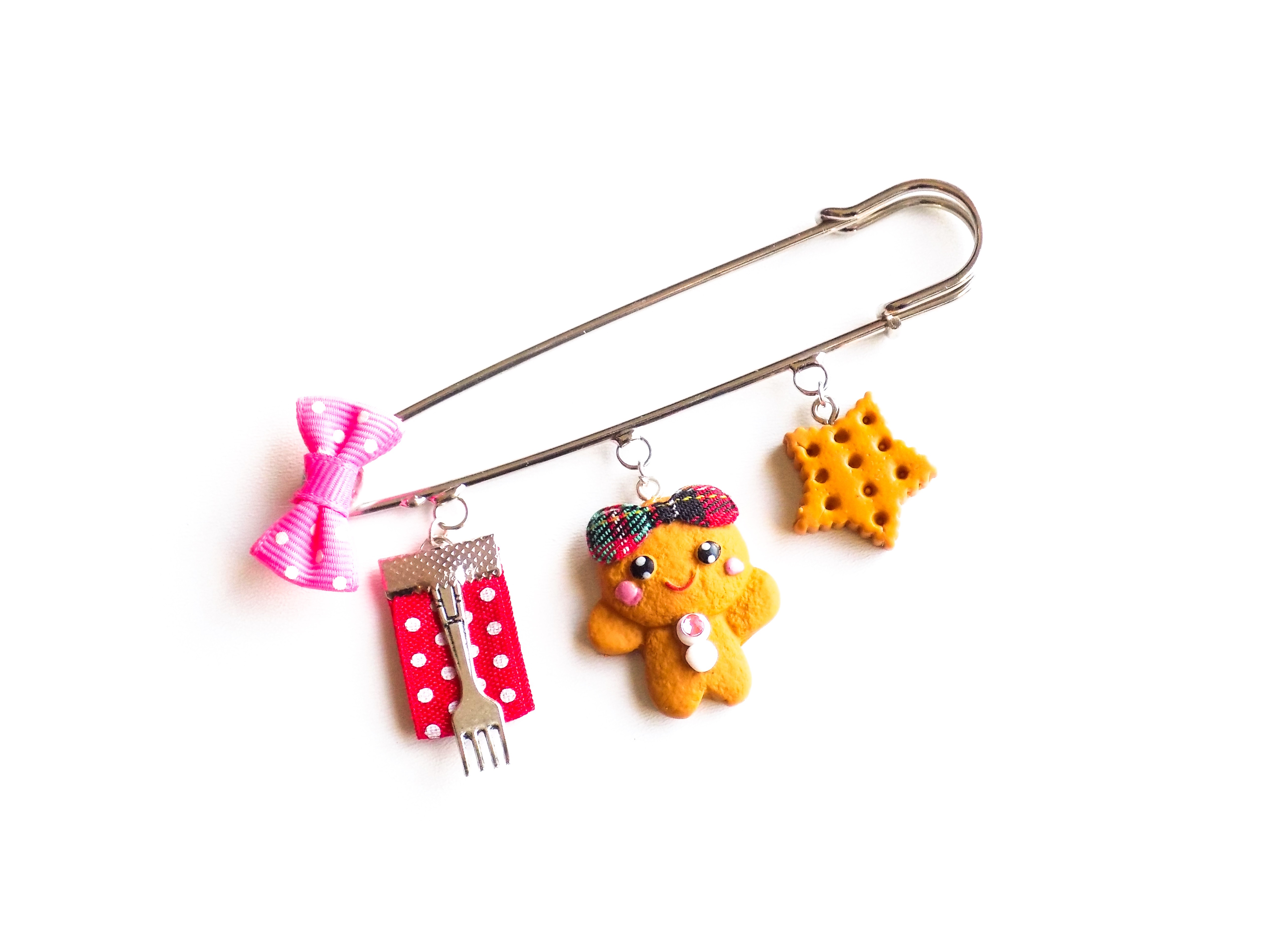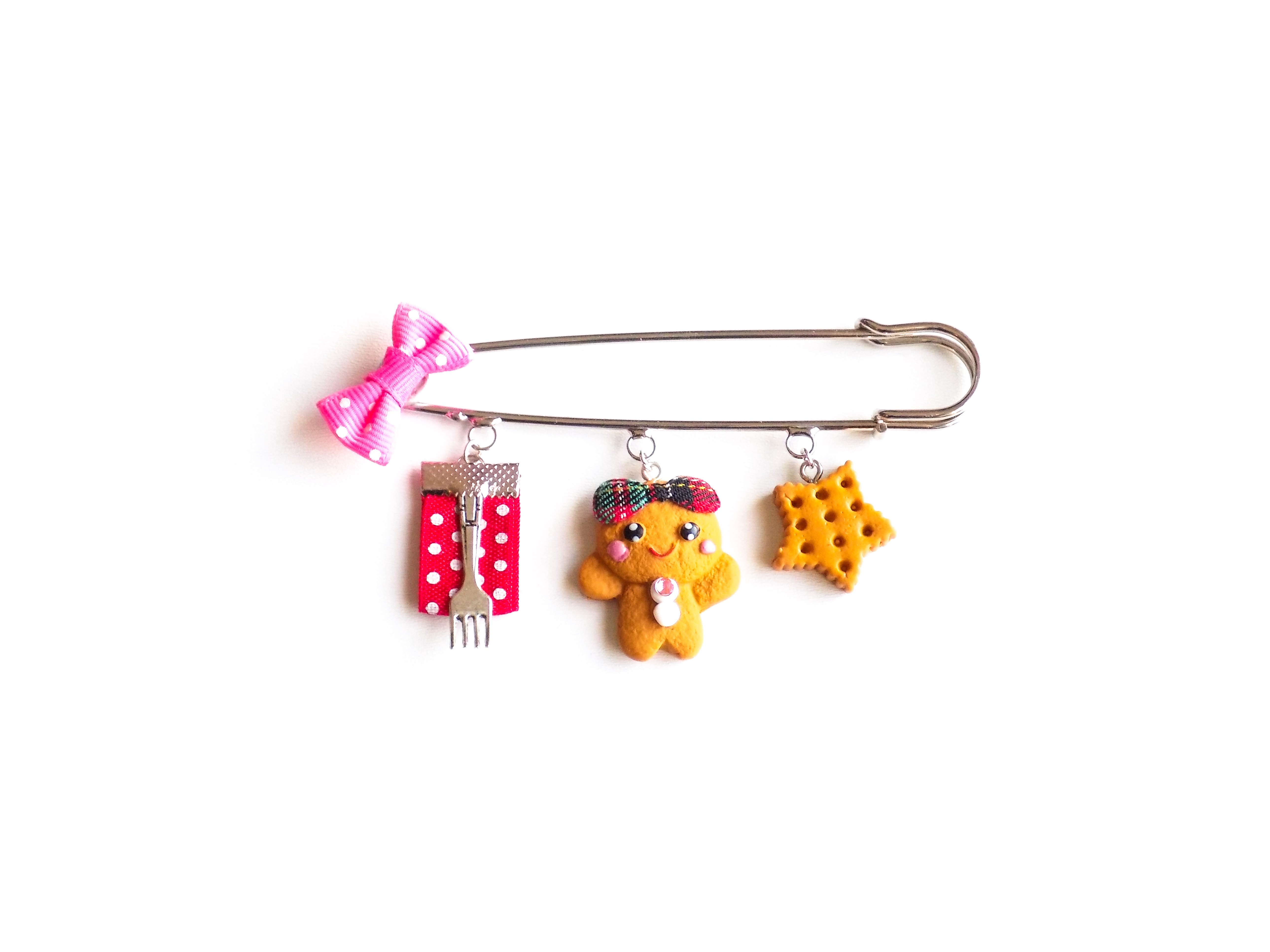 Support métal argenté avec son petit gingerbread tout mignon confectionné artisanalement, agrémenté d'une breloque gourmande, d'une breloque ruban et fourchette et d'un noeud gros grain à petits pois.