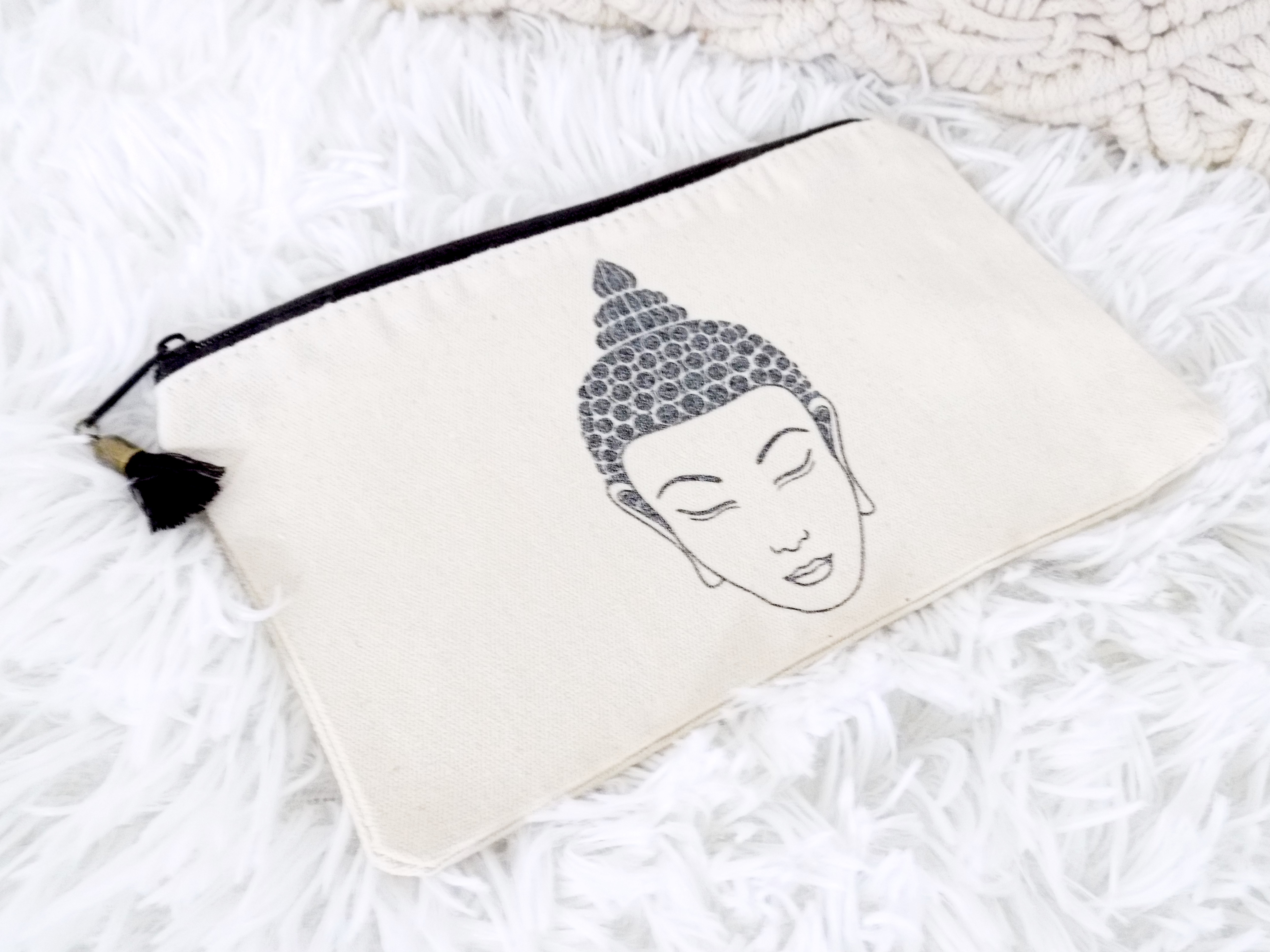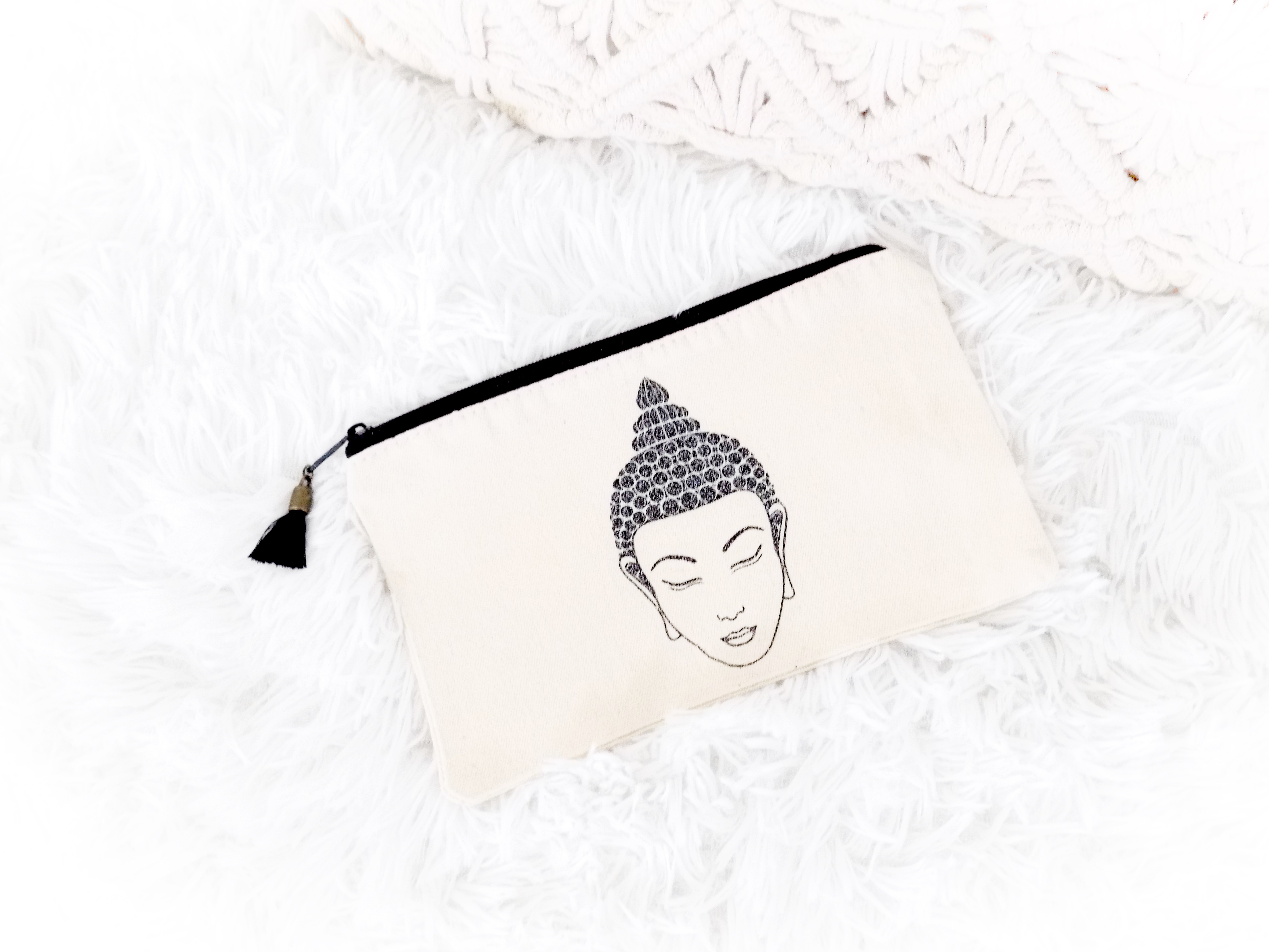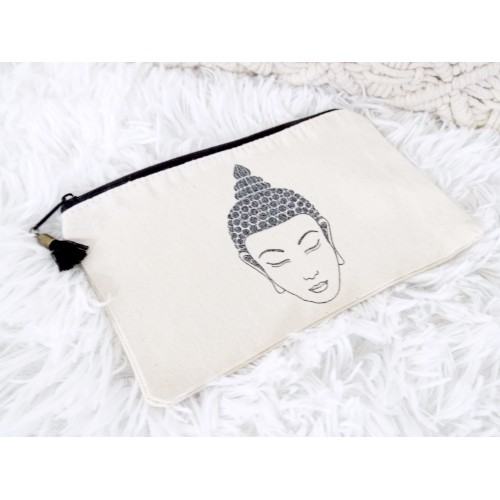 Magnifique pochette avec un très joli bouddha noir pailleté, agrémentée d'une breloque pompon noir et bronze sur le zip pour le côté fun !