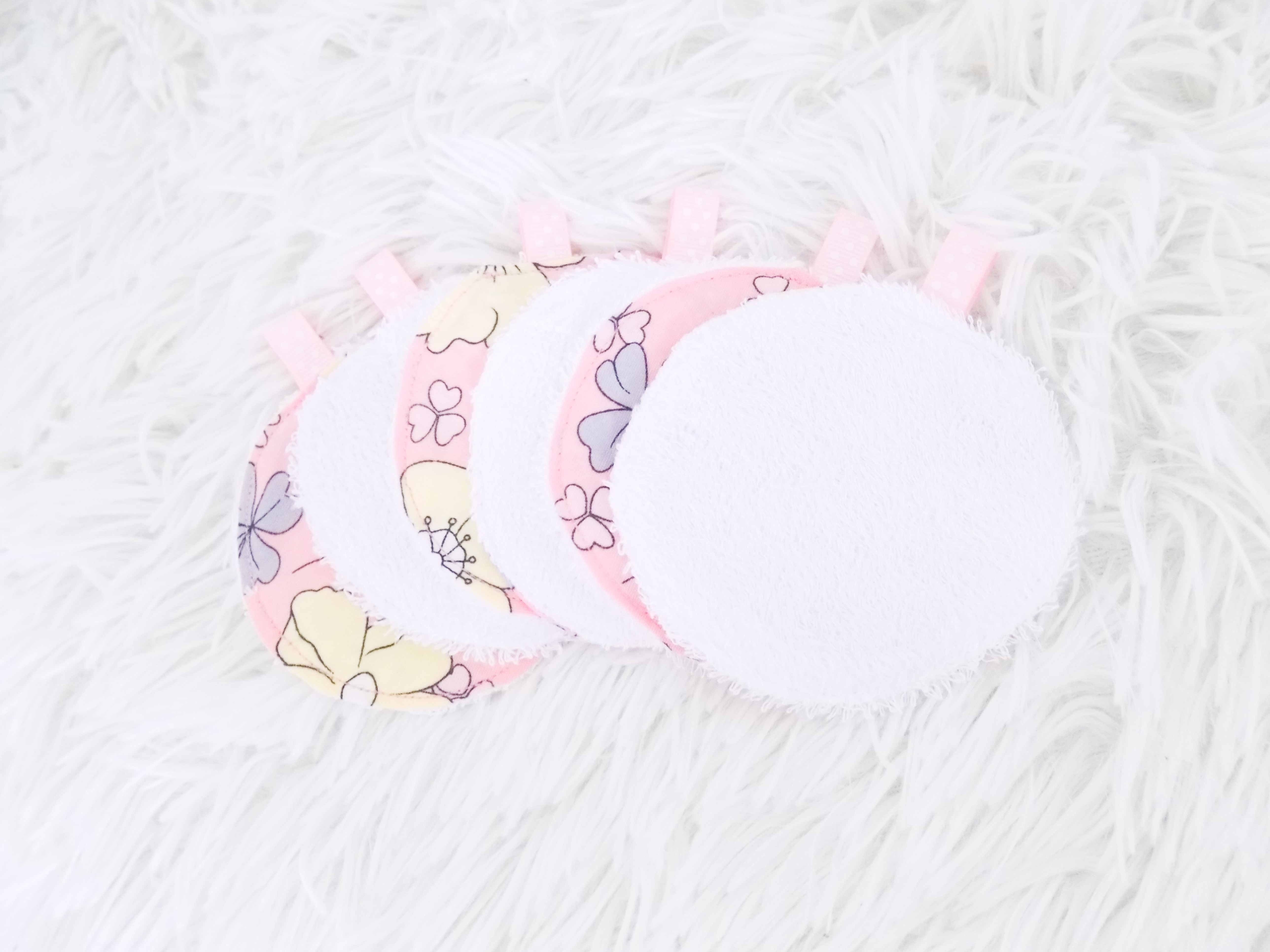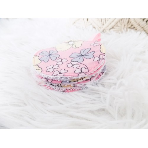 Lot de six disques démaquillants lavables avec attache en ruban gros grain ( recto: 100 % coton / verso: tissu éponge de bambou, très doux et résistant au lavage ) qui remplacent avantageusement les lingettes jetables classiques et le coton tout en vous faisant faire des économies : réutilisables, pratiques, ils peuvent être utilisés pour le nettoyage du visage comme lingettes démaquillantes, pour appliquer une lotion, pour le change de bébé etc.