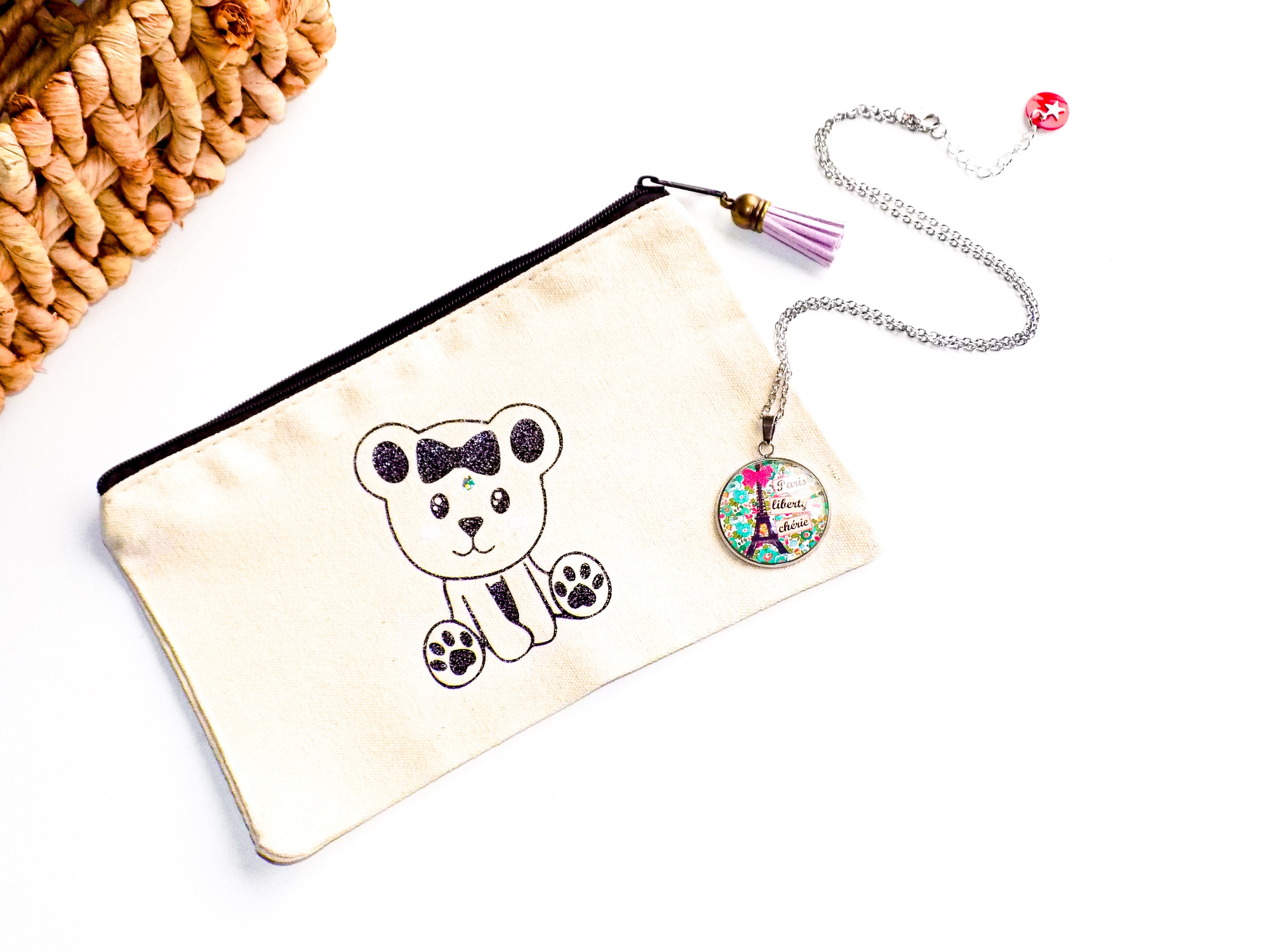 Magnifique pochette avec un petit ourson kawaii pailleté, agrémentée d'une breloque pompon rose sur le zip pour le côté fun !