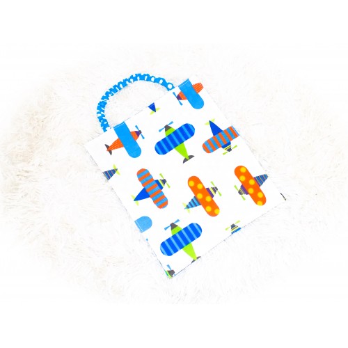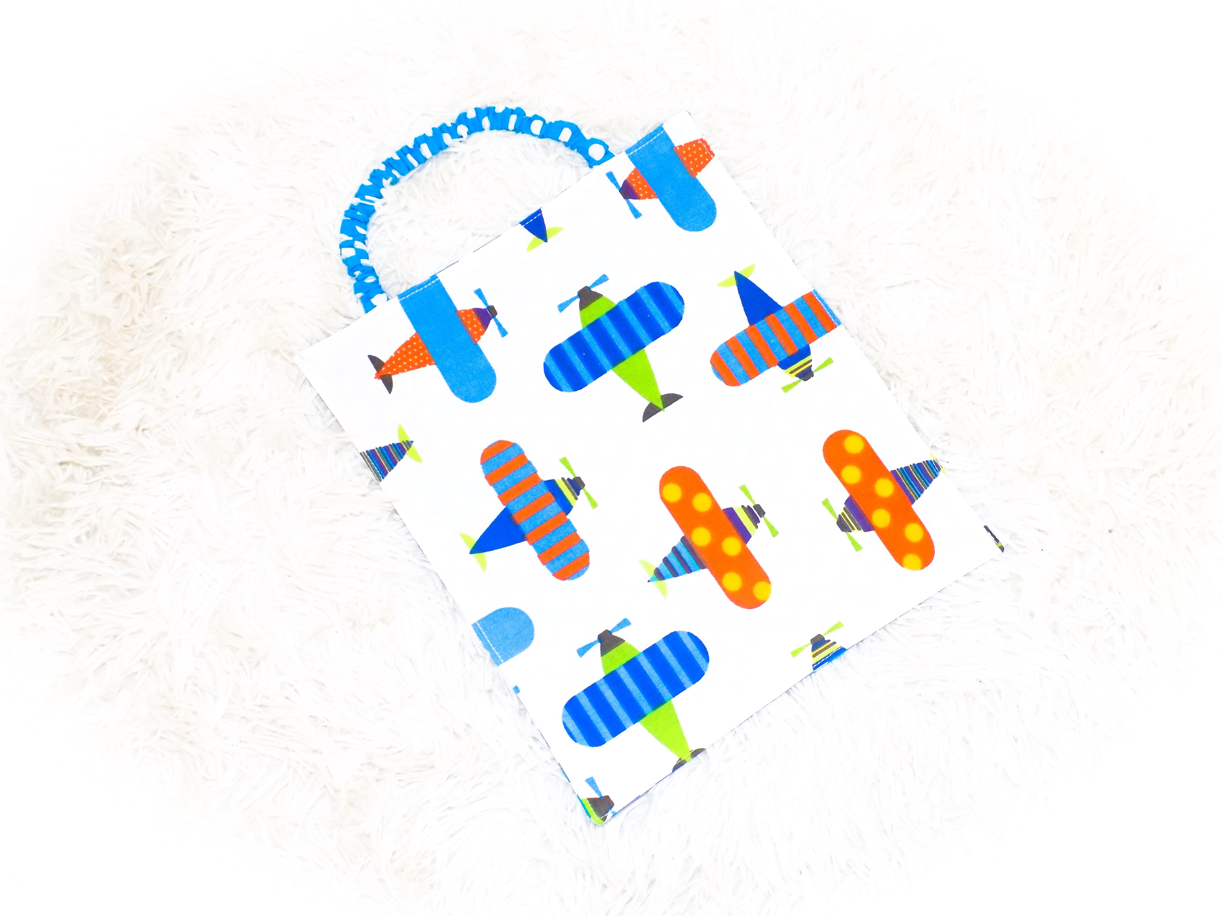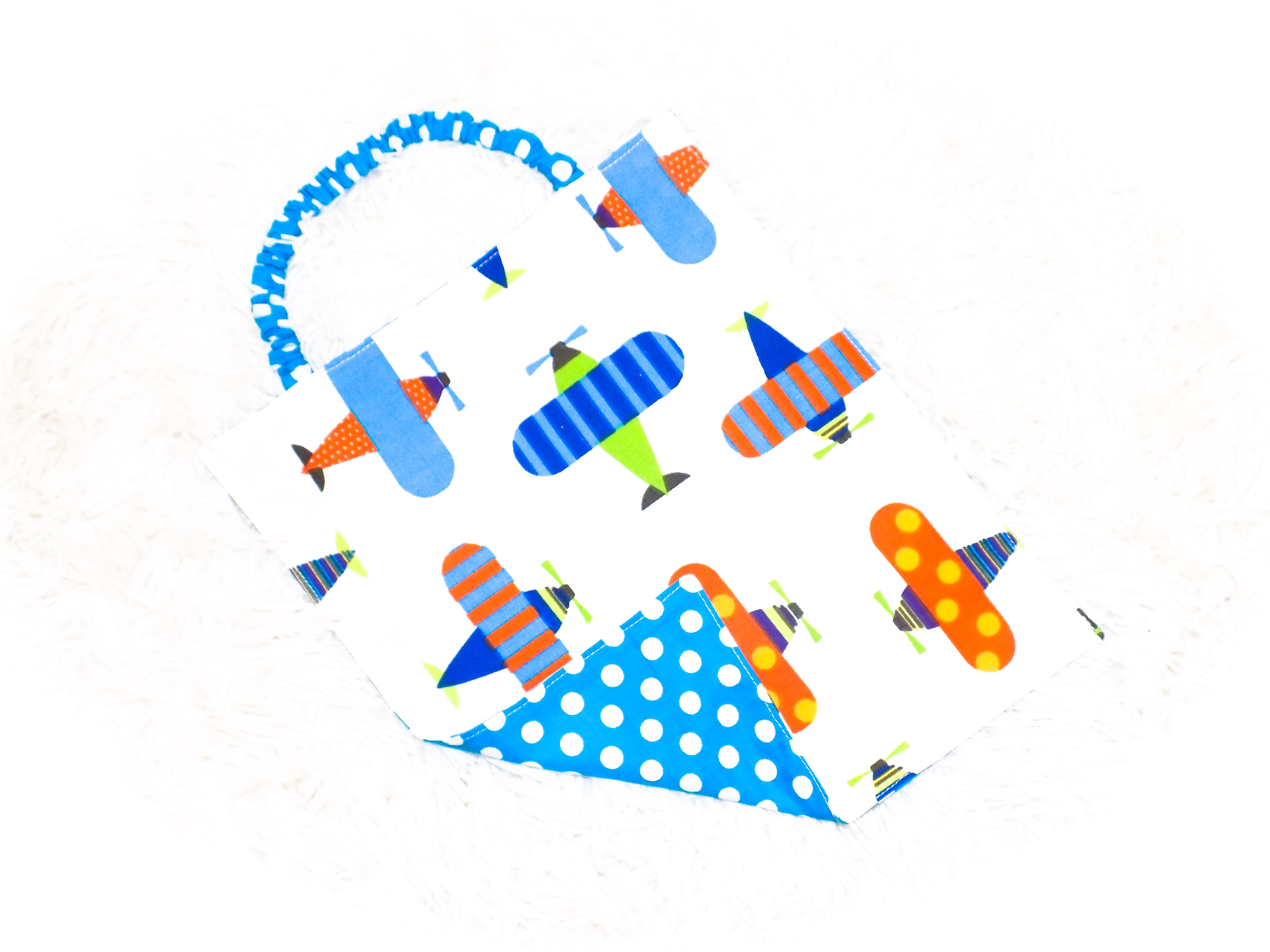 Recto en coton imprimé avions pour égayer les repas, verso bleu imprimé petits pois.