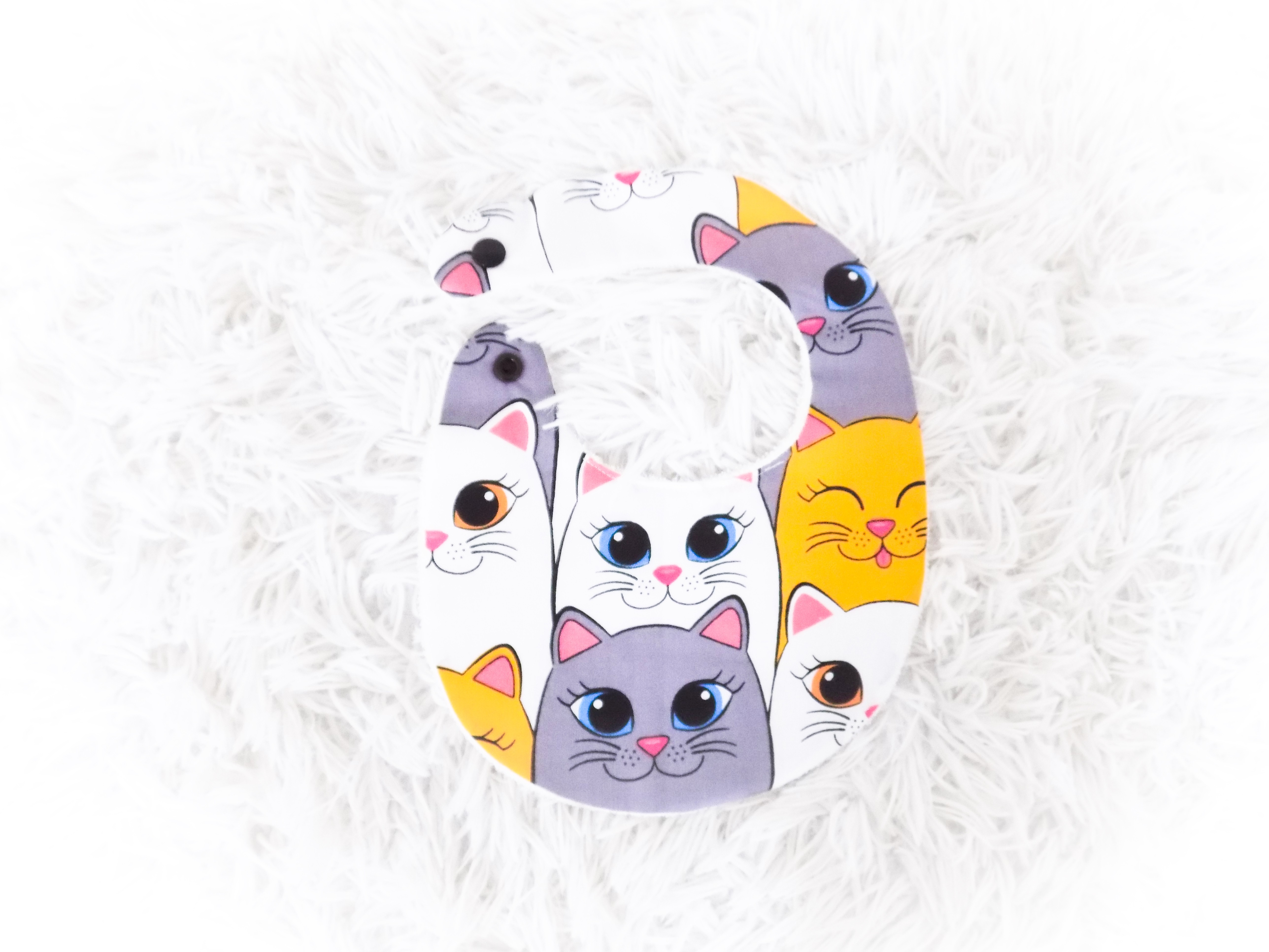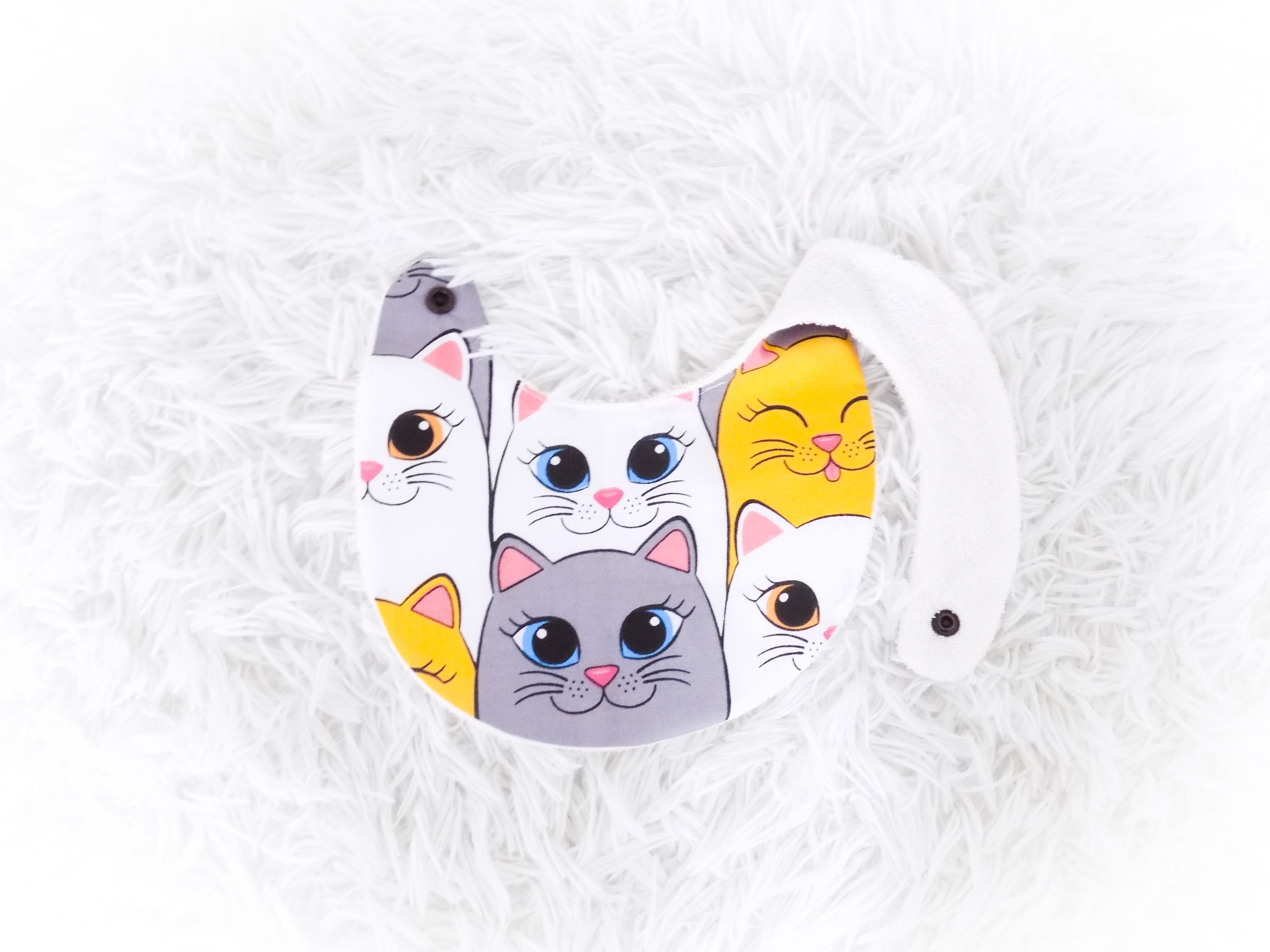 ♡ Farandole de chats ♡ Bavoir, taille 0/6 mois, chats, félin, blanc, gris, noir, jaune, rose, multicolore, article bébé, cadeau naissance, fait-main