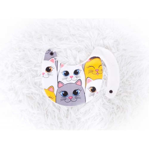 Recto en coton imprimé petits chats pour égayer les repas, verso en tissu éponge naturelle de bambou, une éponge fine, souple et extra douce, idéale pour les articles de puériculture.