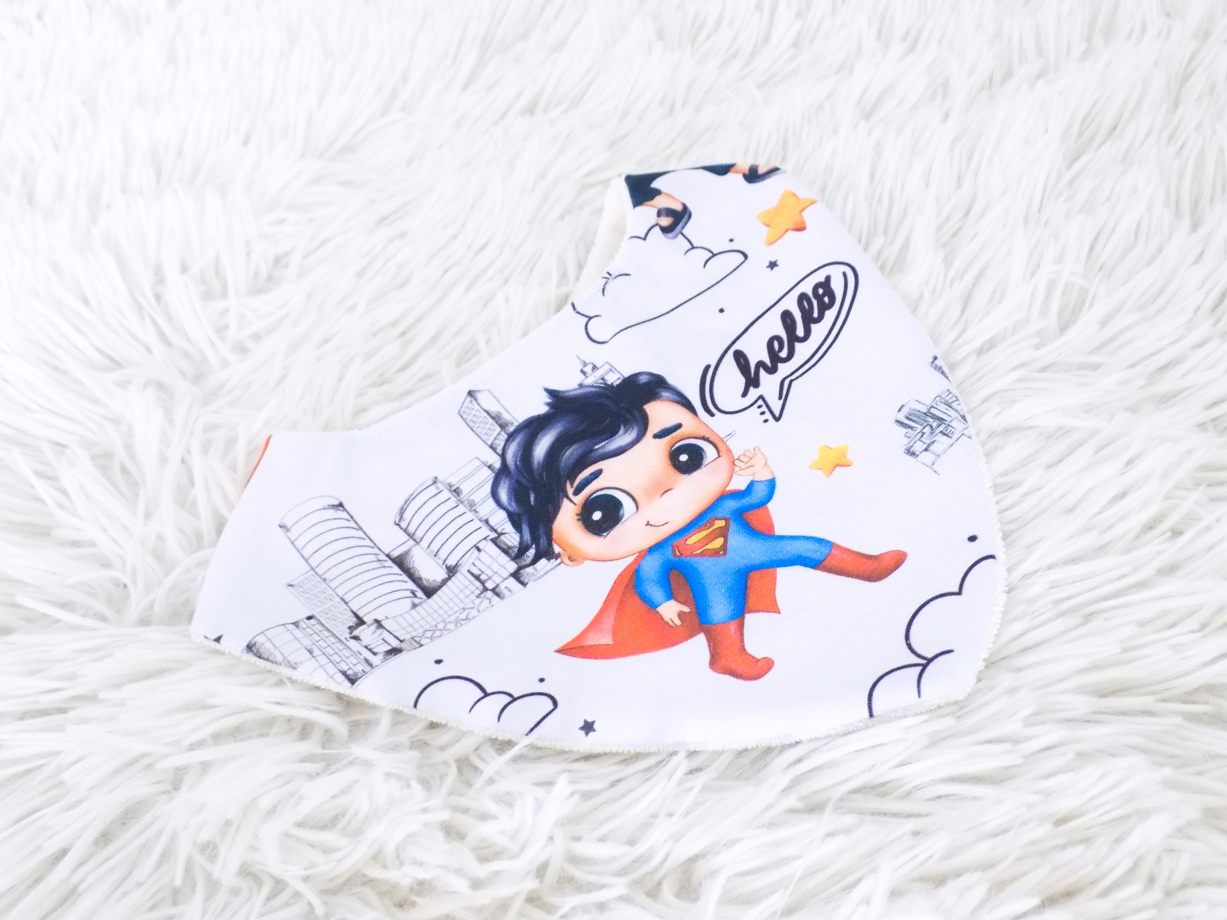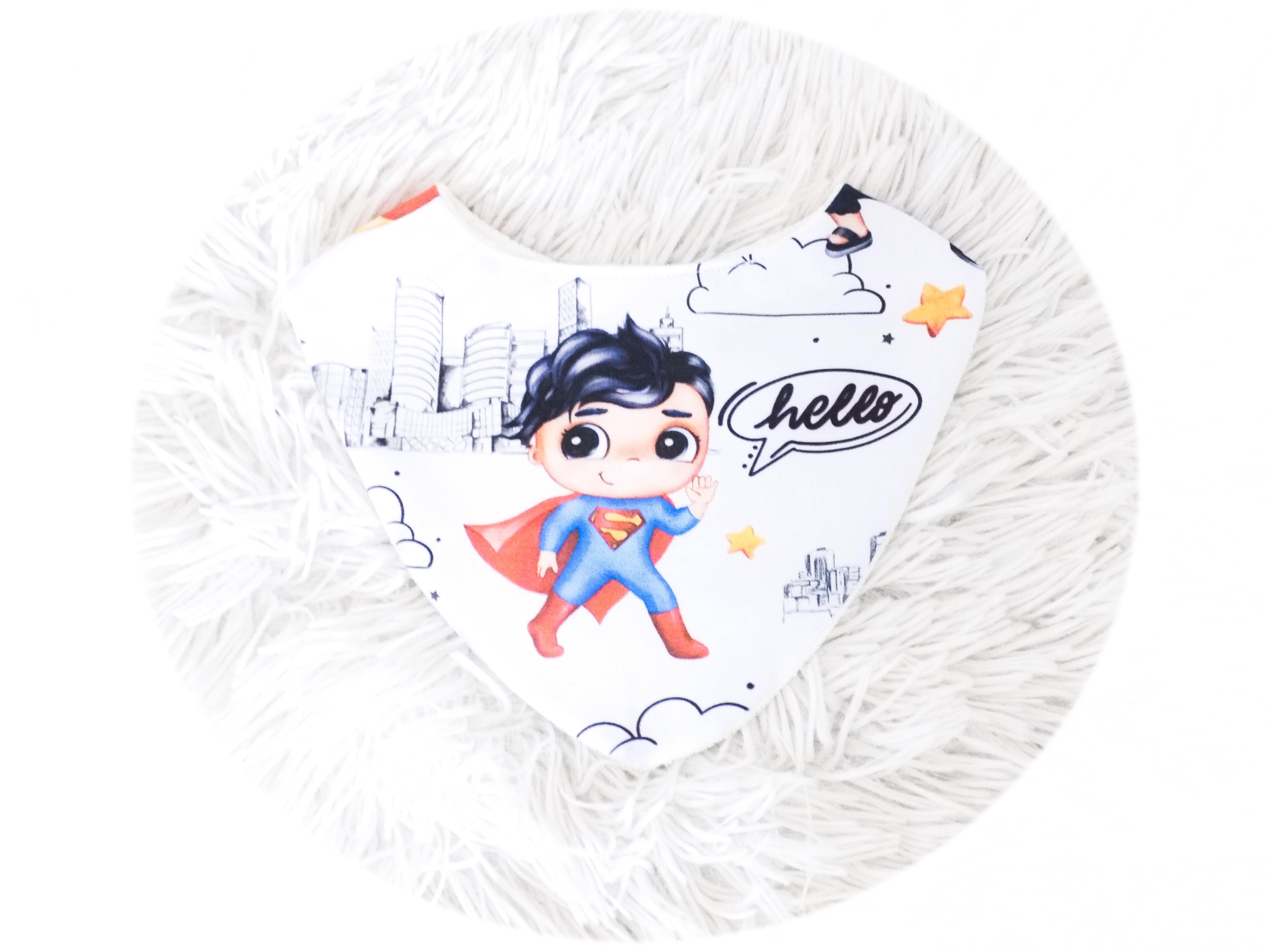 ♡ Super M ♡ Bavoir, taille 0/24 mois, blanc, noir, jaune, rouge, bleu et multicolore, super héros, superman, article bébé, cadeau naissance, fait-main