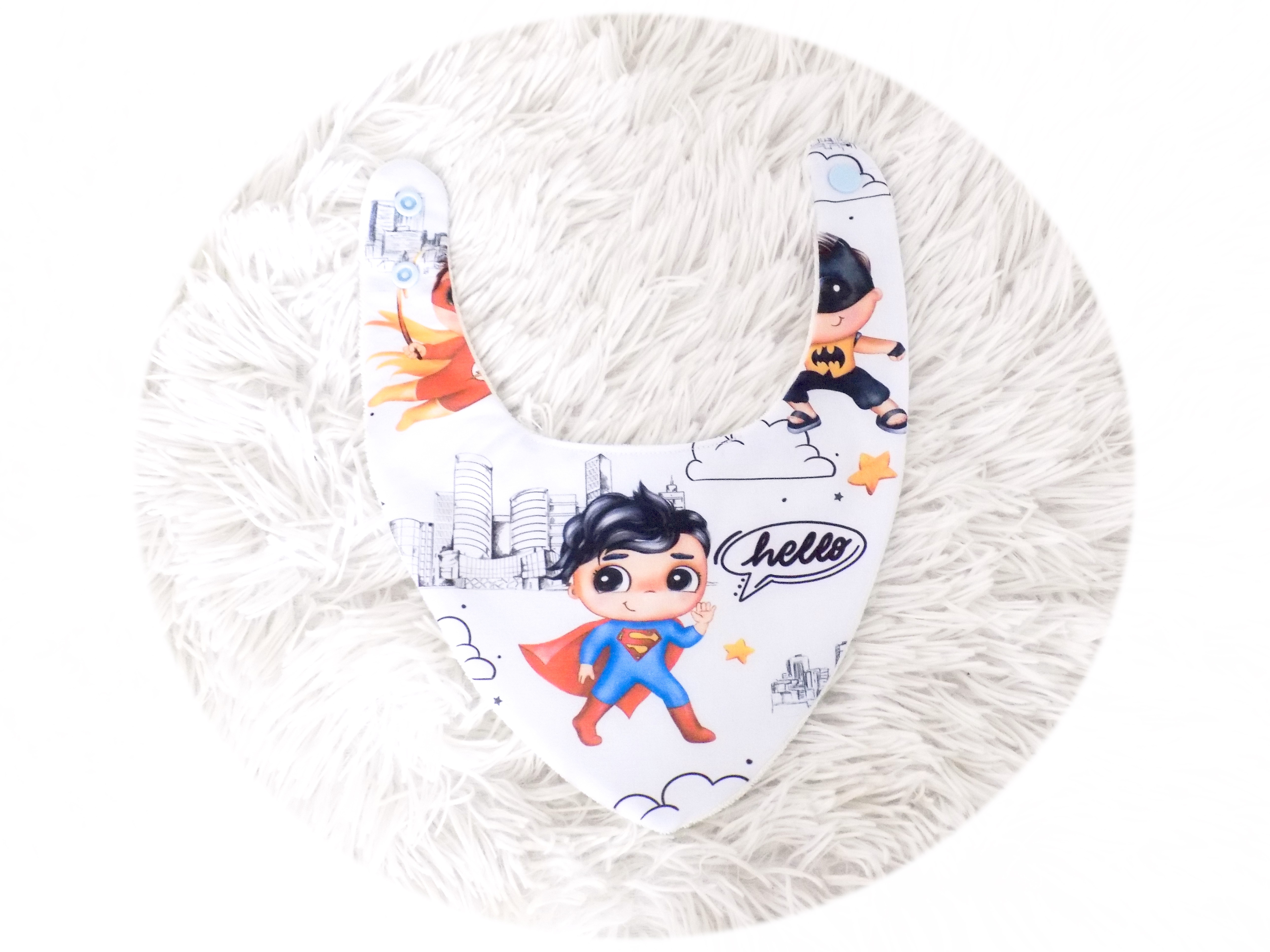 Recto en coton imprimé super héros pour égayer les repas, verso en tissu éponge naturelle de bambou, une éponge fine, souple et extra douce, idéale pour les articles de puériculture.