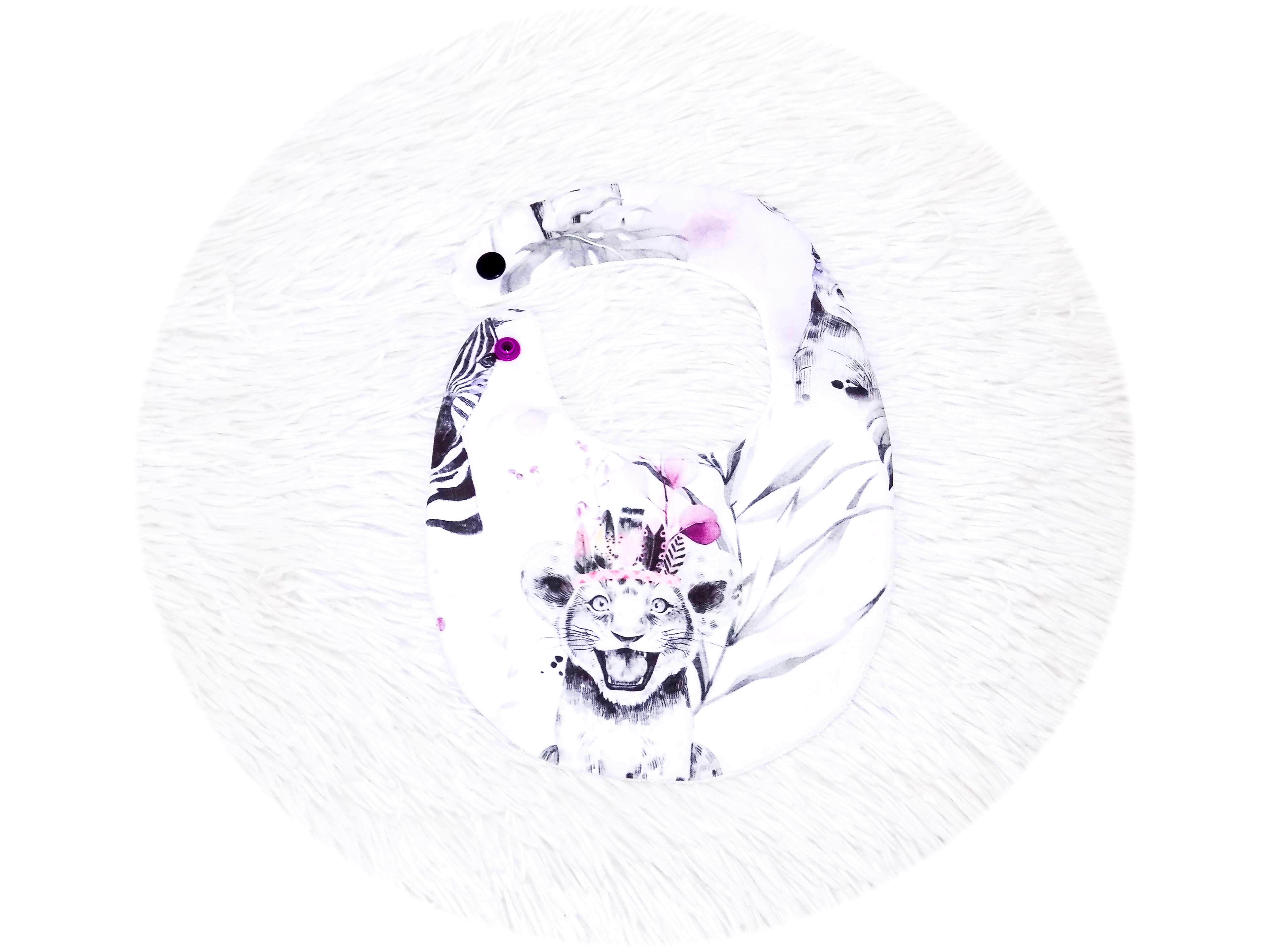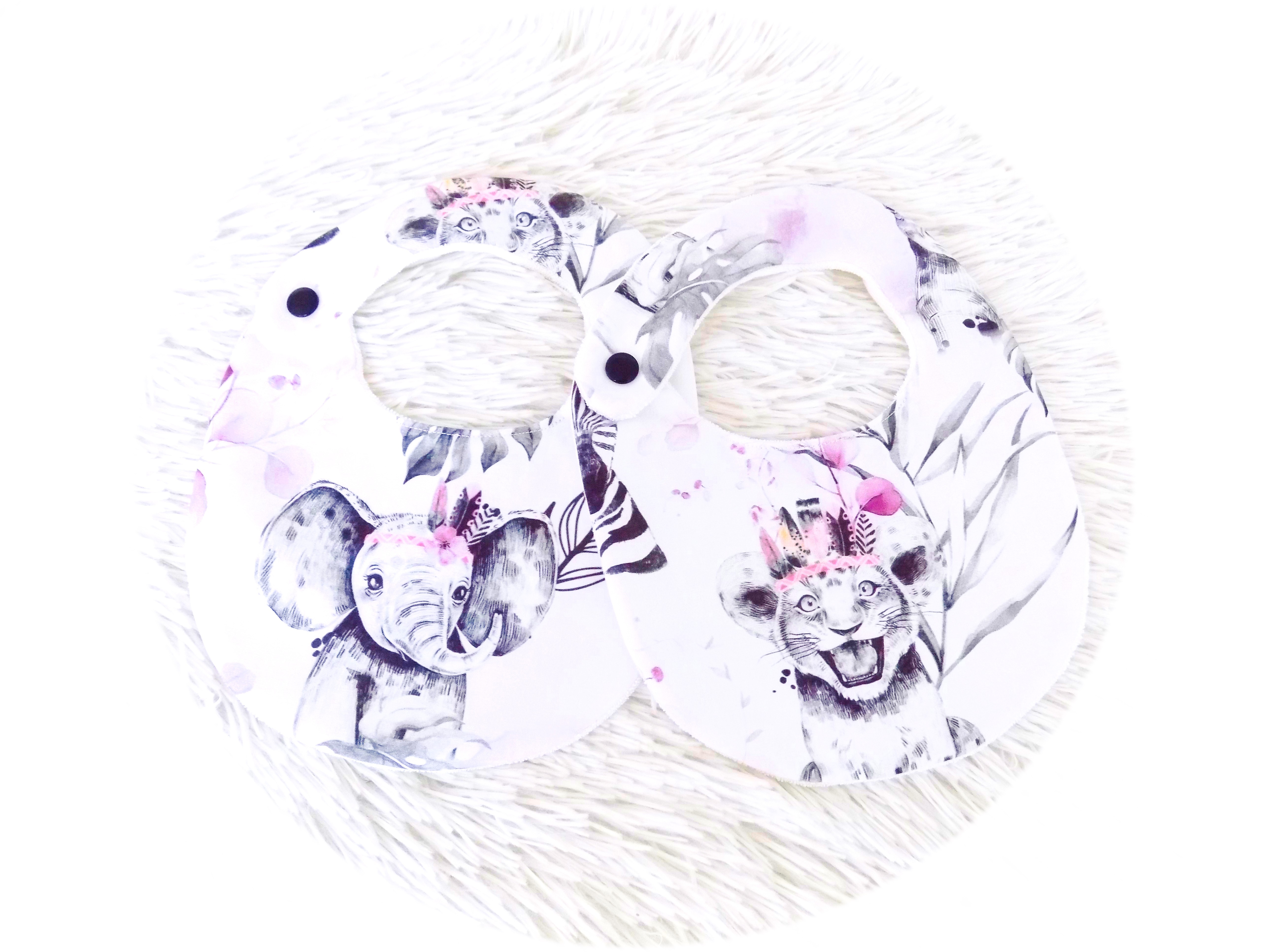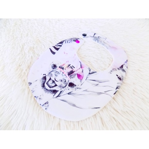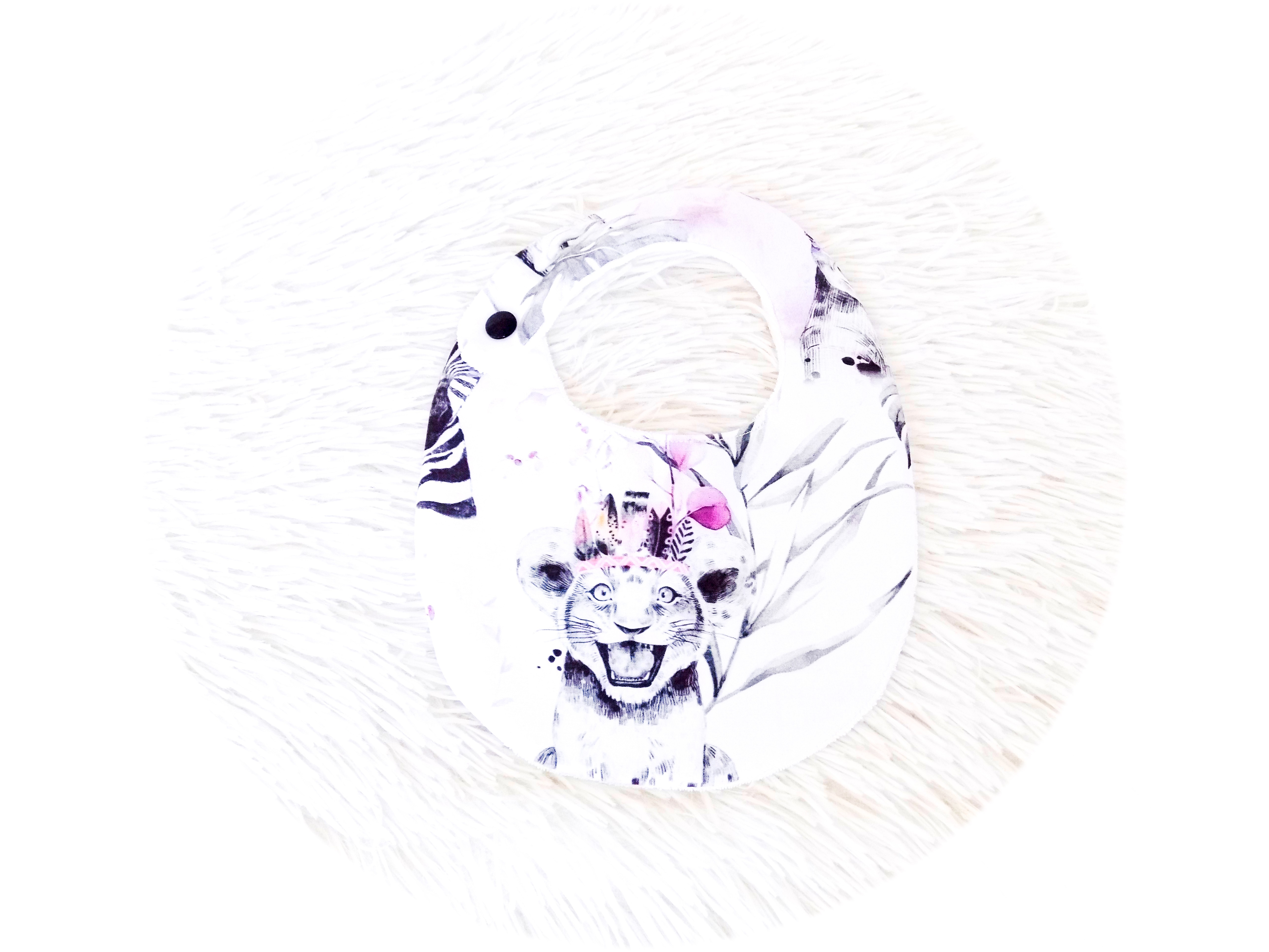 Recto en coton imprimé petit lion pour égayer les repas, verso en tissu éponge naturelle de bambou, une éponge fine, souple et extra douce, idéale pour les articles de puériculture.