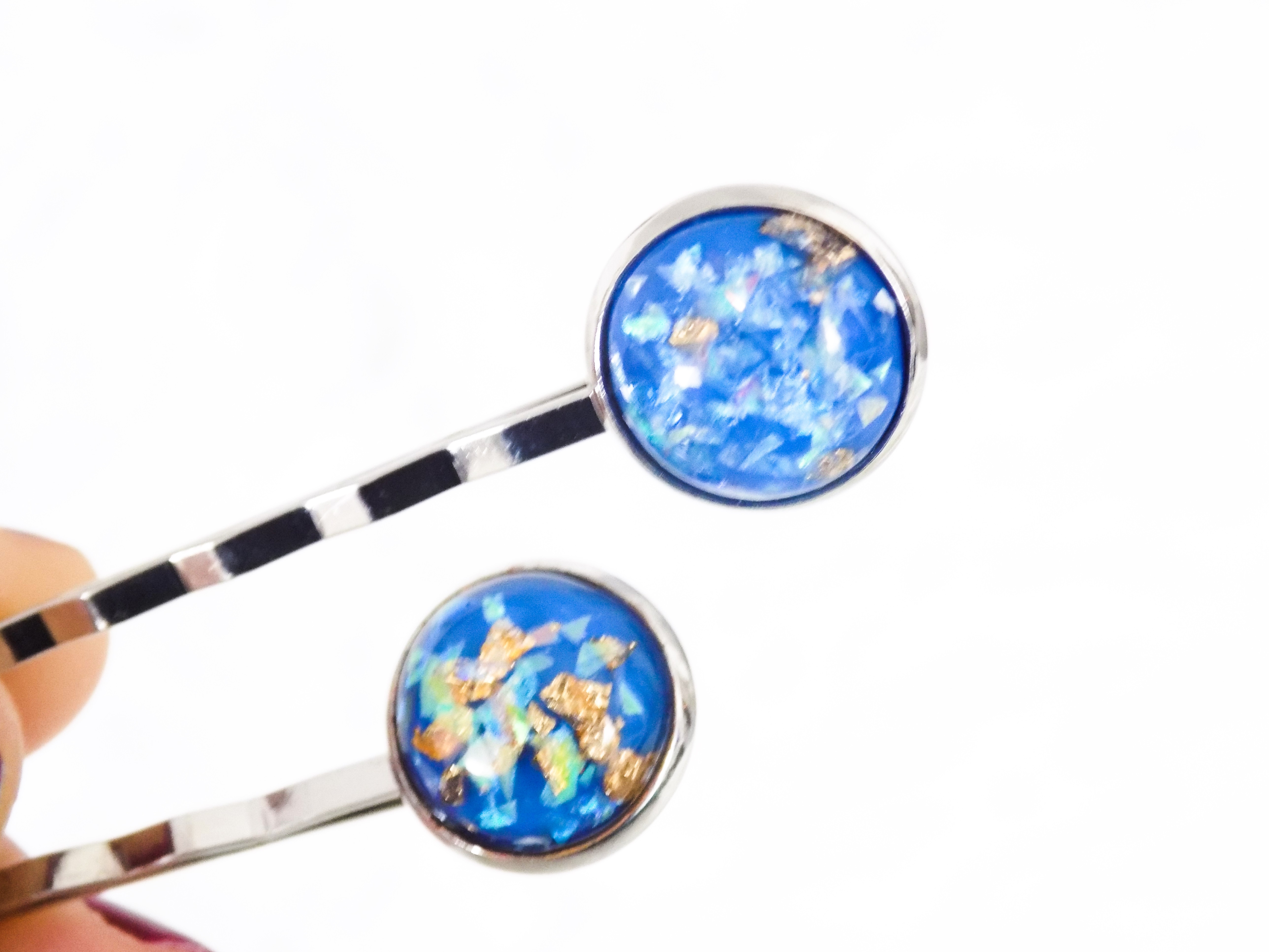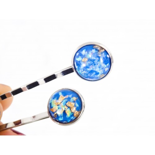 Supports métal argenté agrémentés d'un cabochon bleu paillettes or.