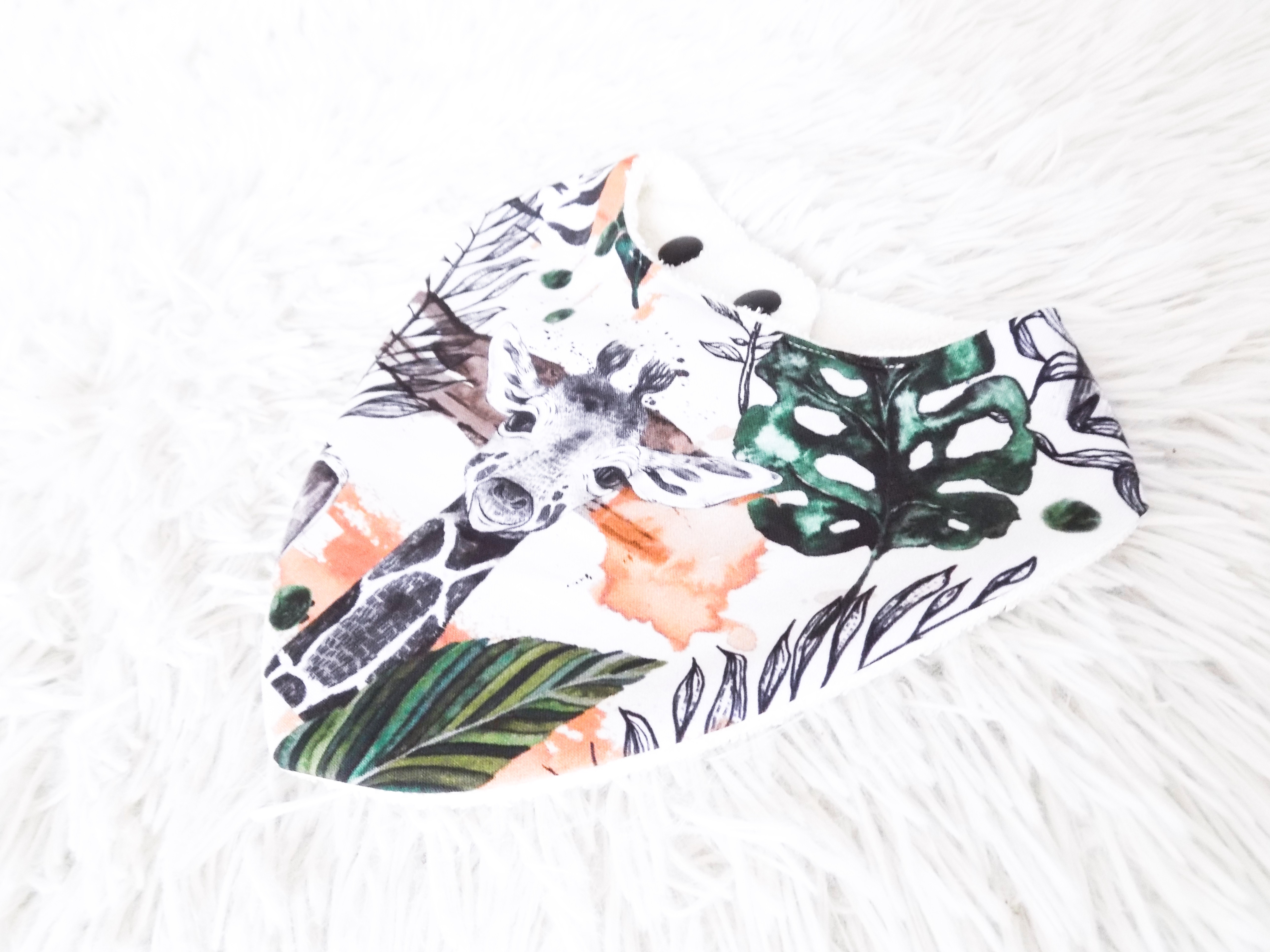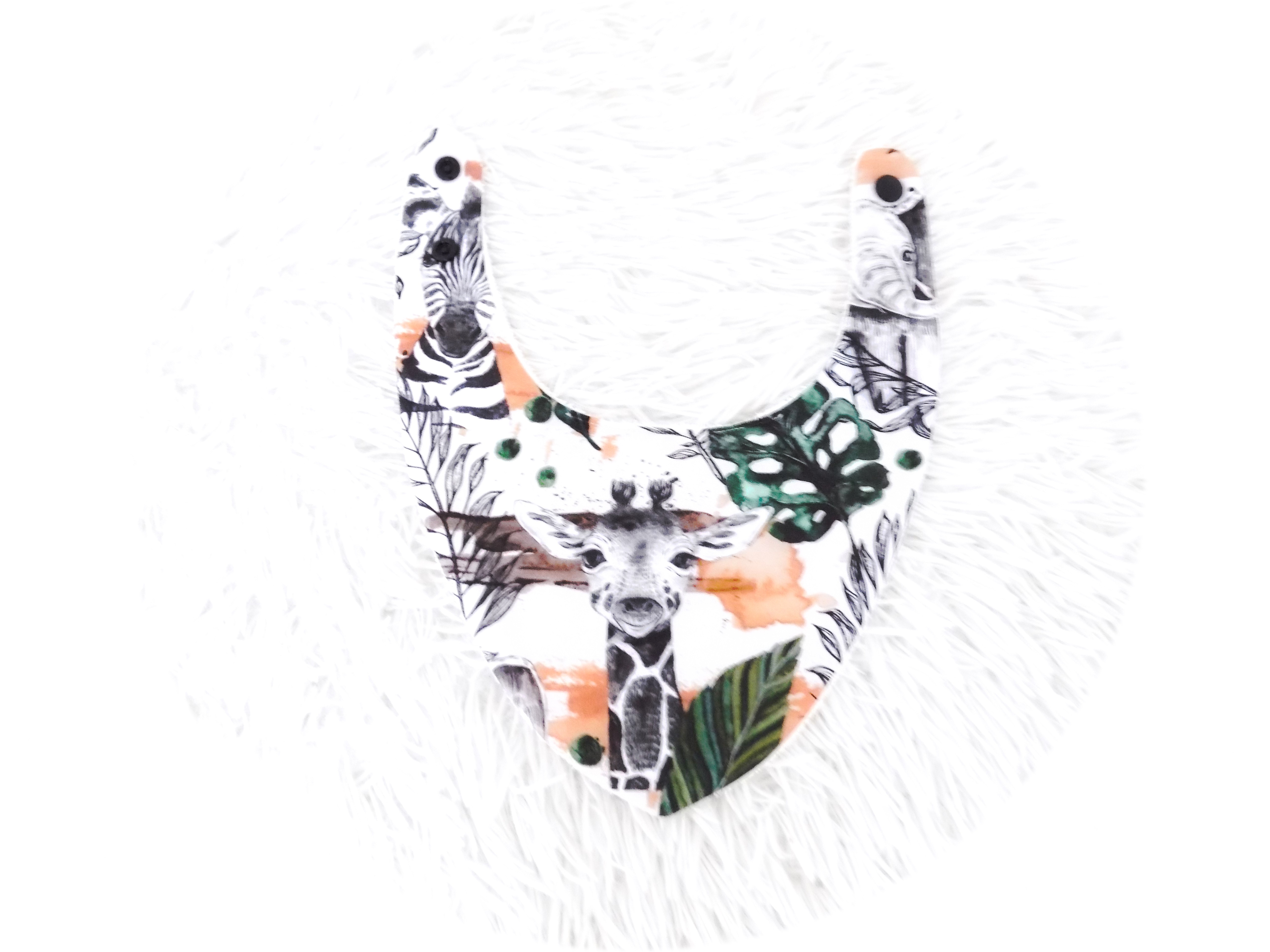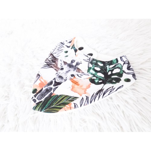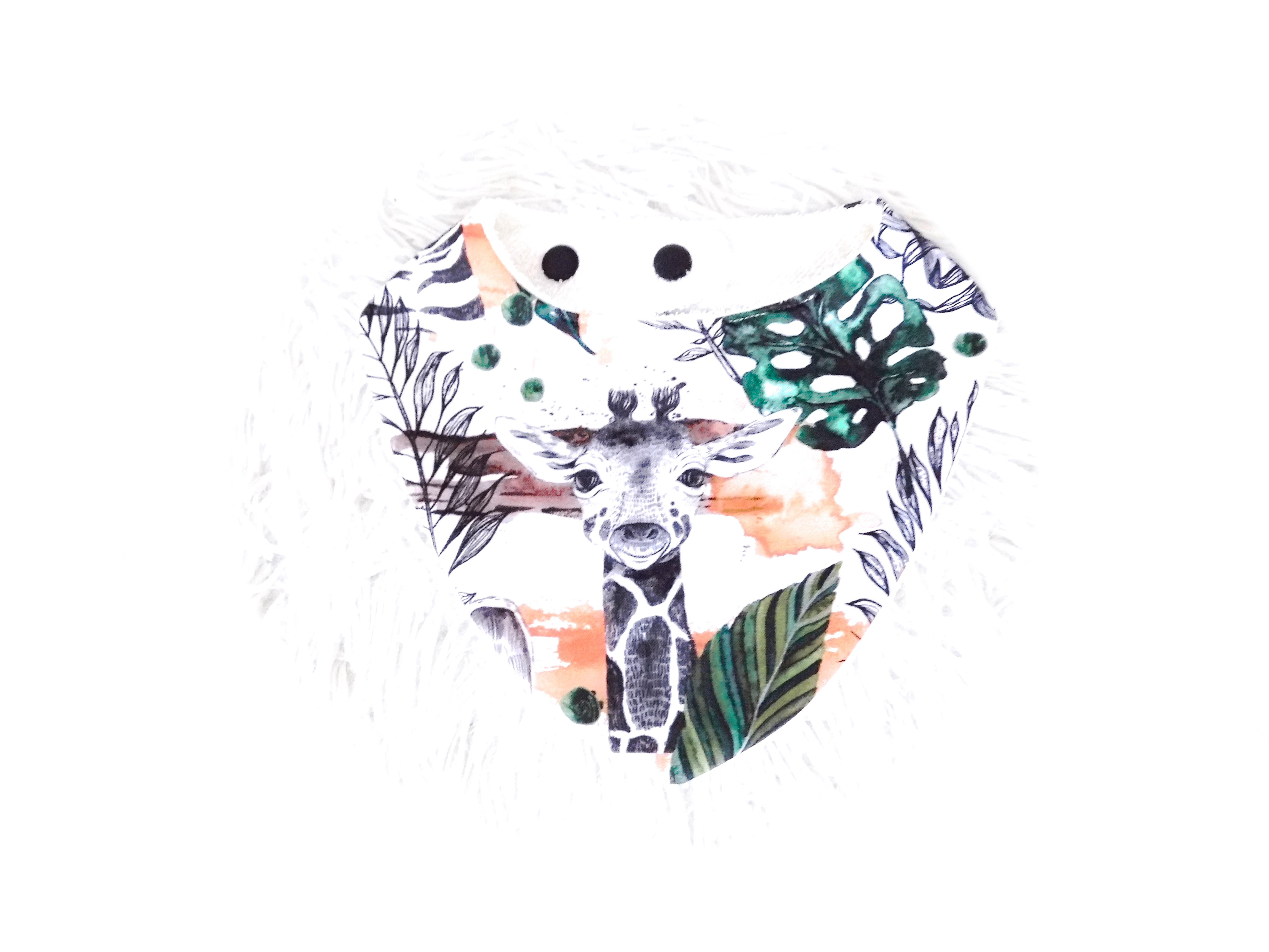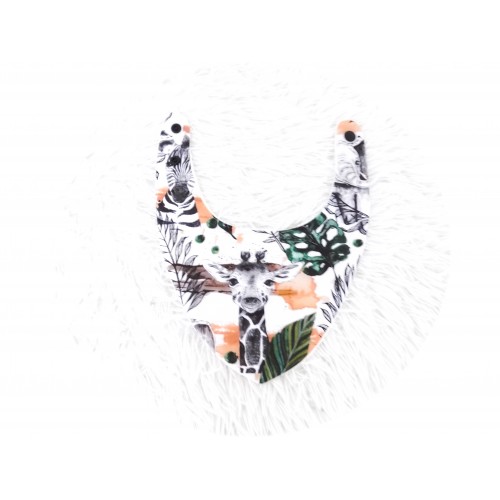 Recto en coton imprimé girafe pour égayer les repas, verso en tissu éponge naturelle de bambou, une éponge fine, souple et extra douce, idéale pour les articles de puériculture.