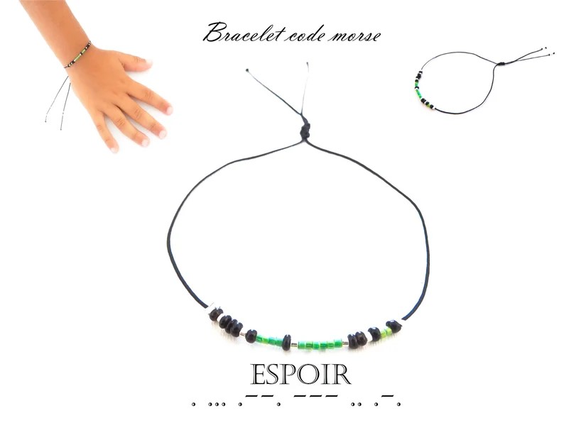 ♡ Espoir ♡ Bracelet, message d'amour en code morse, cadeau artisanal, bijou message, cordon, vert, perles, cadeau femme ou homme, Saint-Valentin, pièce unique, fait-main