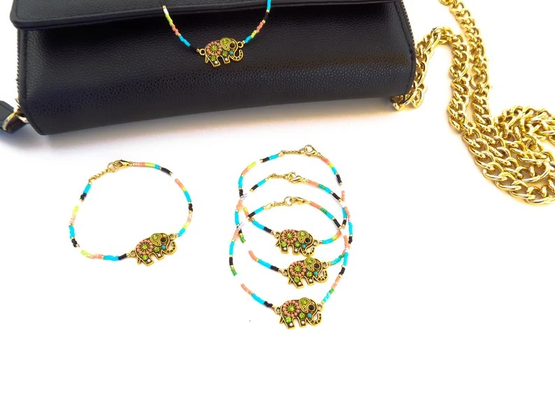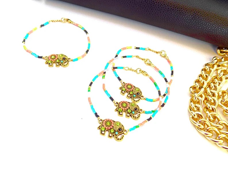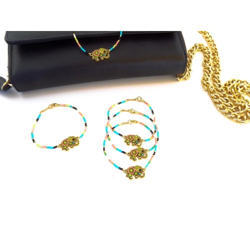Ravissant bracelet confectionné de manière artisanale avec des perles multicolores et un connecteur éléphant strassé.