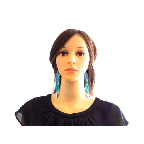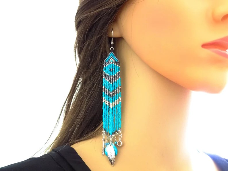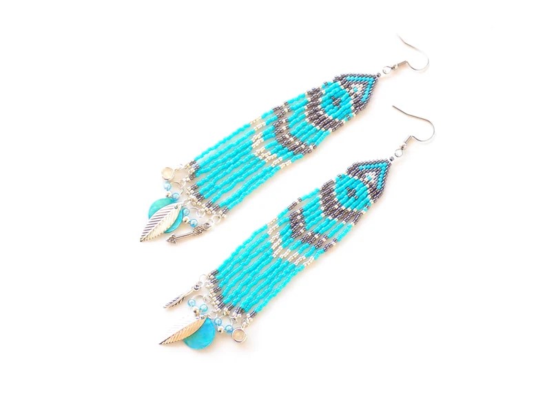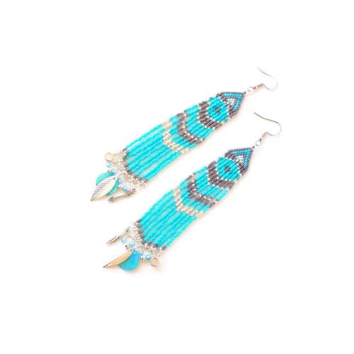 Ravissantes boucles d'oreilles confectionnées de manière artisanale grâce à un minutieux et long tissage de perles, agrémentées de breloques.