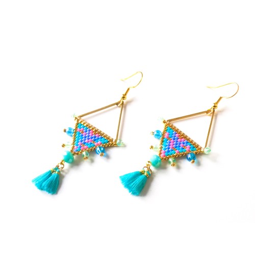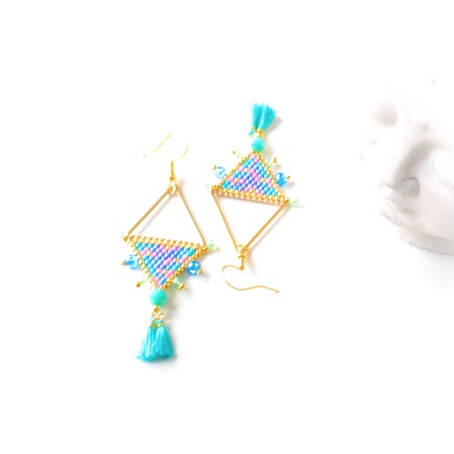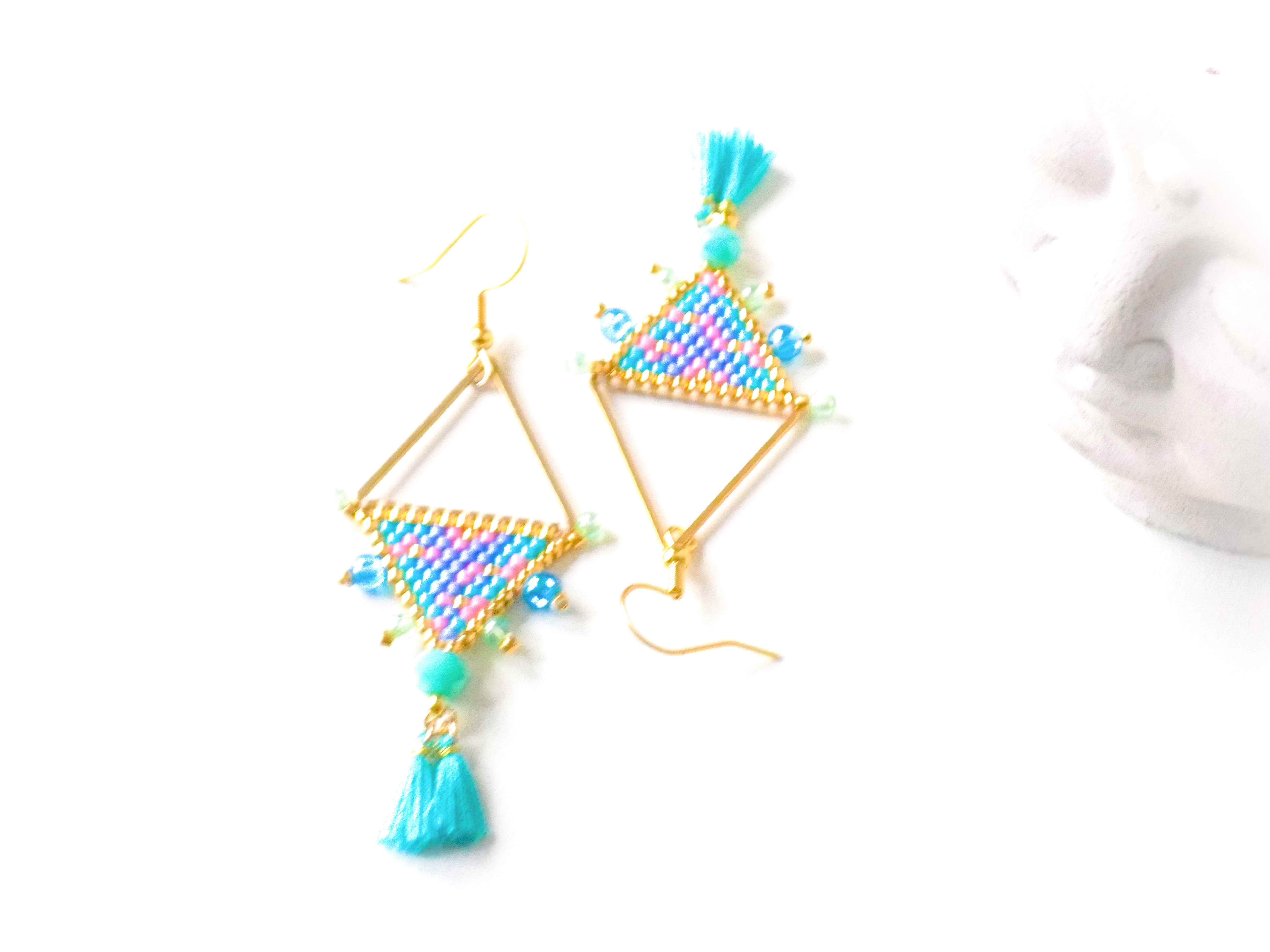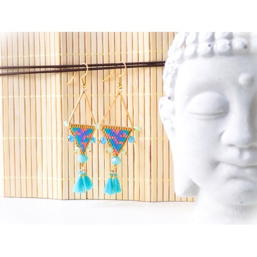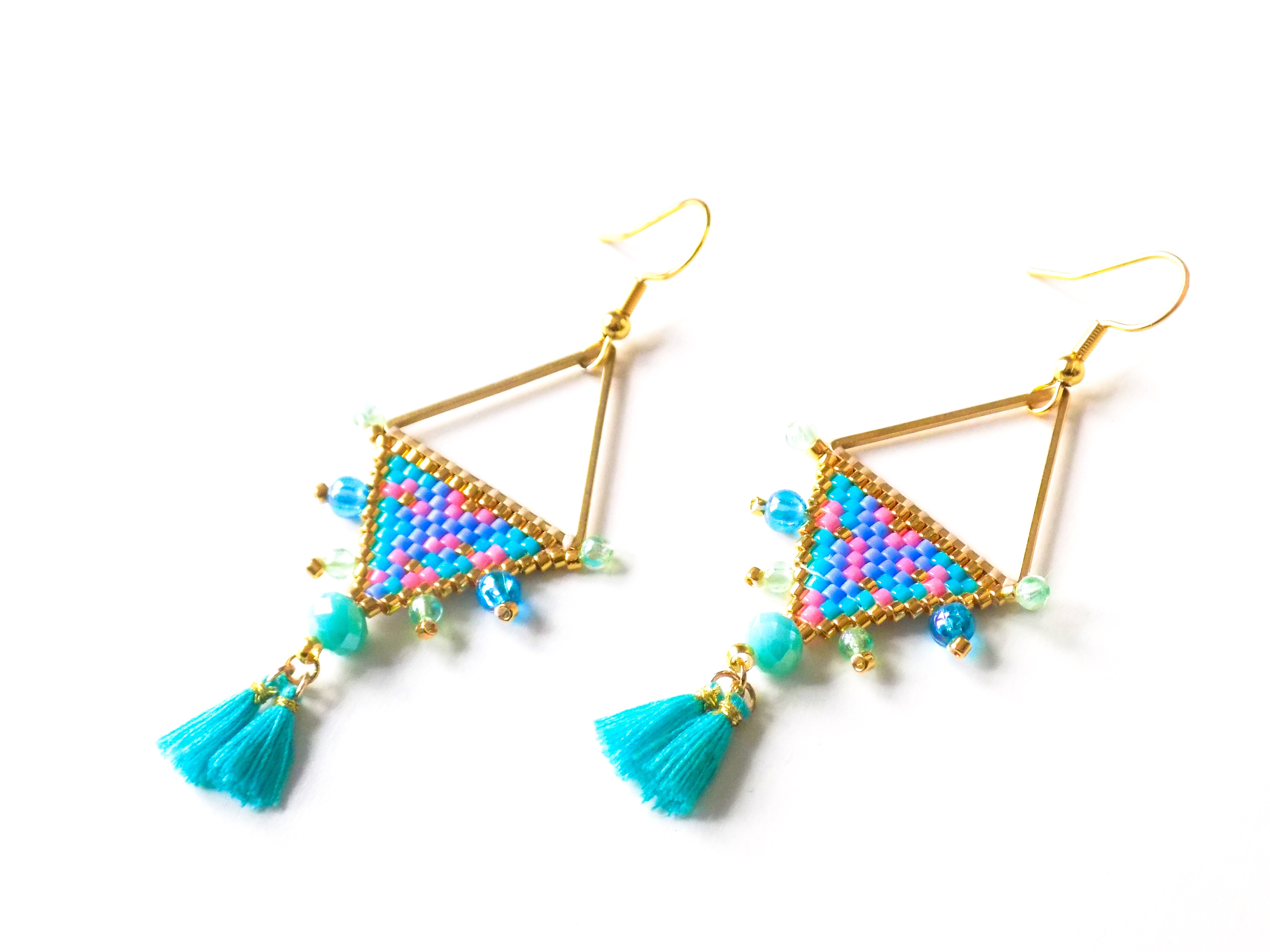 Ravissantes boucles d'oreilles confectionnées de manière artisanale avec des perles japonaises de qualité supérieure et agrémentées de perles acryliques et de jolis pompons.