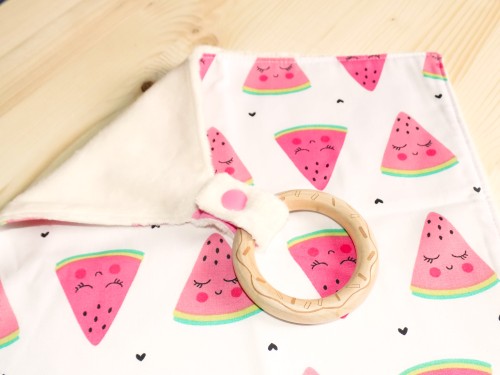 Il stimulera l'éveil et la motricité de bébé grâce aux images du tissu imprimé et à ses différentes textures. Il possède une attche avec bouton pression à laquelle est fixé un anneau de bois naturel non traité ( en forme de biscuit) que bébé pourra mordiller lors de ses poussées dentaires, l'anneau s'enlève facilement pour le laver ou fixer à la place une tétine.