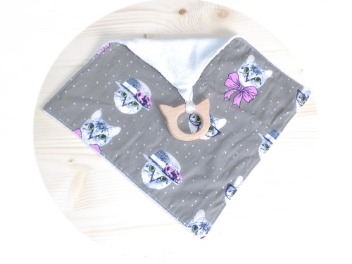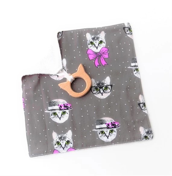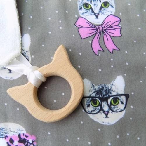 Il stimulera l'éveil et la motricité de bébé grâce aux images du tissu imprimé et à ses différentes textures. Il possède un ruban en satin auquel est fixé un anneau de bois naturel non traité que bébé pourra mordiller lors de ses poussées dentaires, l'anneau s'enlève facilement pour le laver ou fixer à la place une tétine.