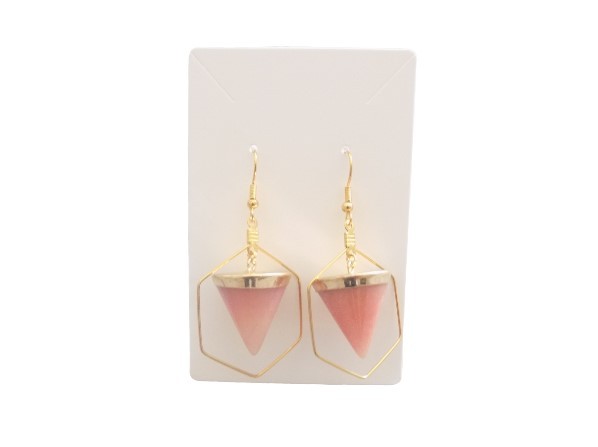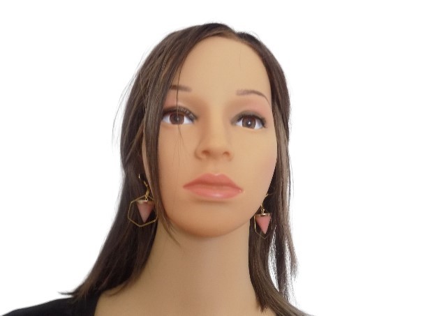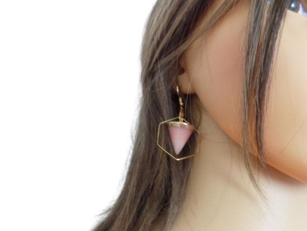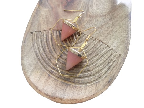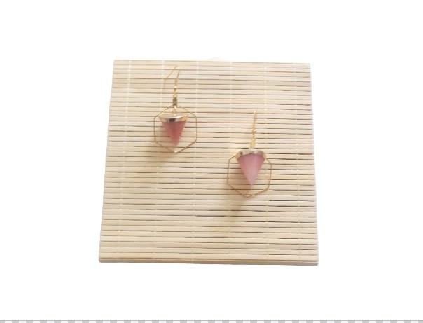 Ravissantes boucles d'oreilles avec pierre naturelle quartz rose. Crochets boules (hypoallergéniques), apprêts et créoles hexagonales en acier inoxydable.