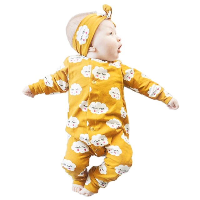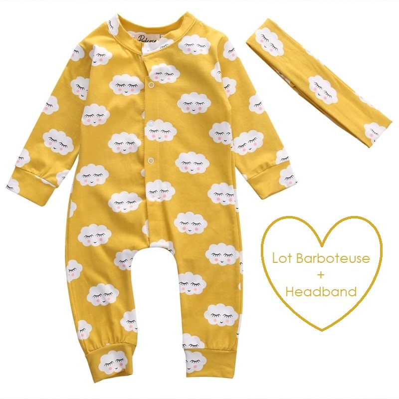 Lot barboteuse et headband assorti, motif petit nuage sur tissu moutarde, confectionné dans une matière fluide qui laissera bébé libre de ses mouvements.