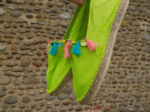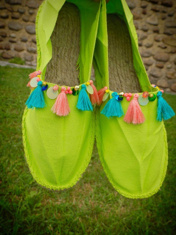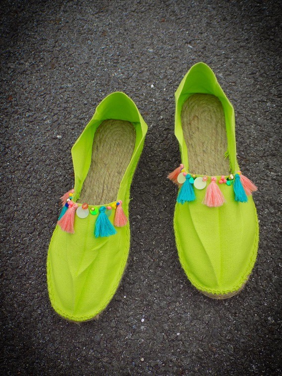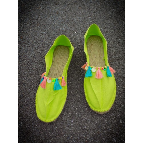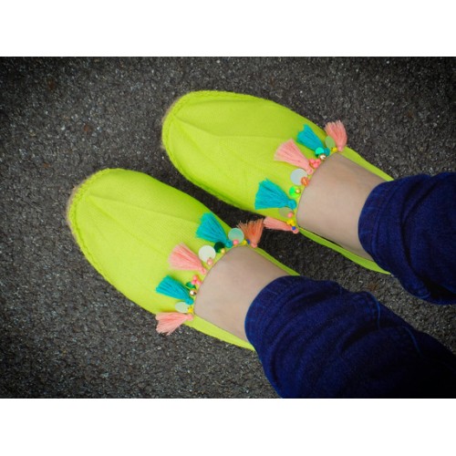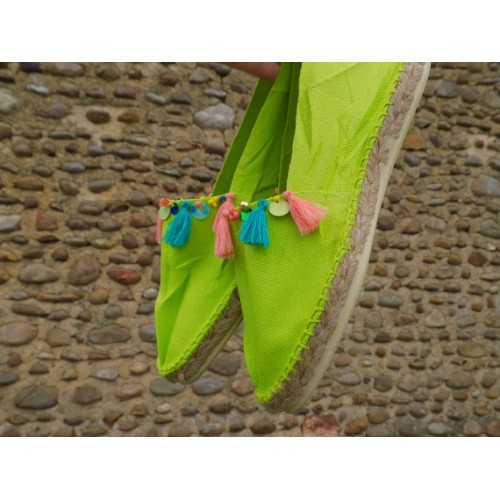 Espadrilles coloris vert anis, agrémentées de sequins, de perles et de pompons.