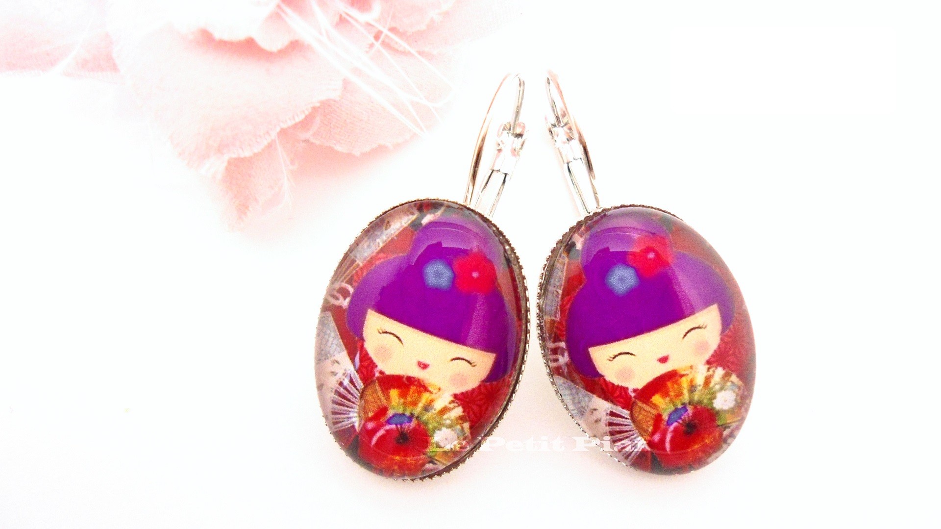 Support métal argenté avec son cabochon en verre, motif kokeshie.