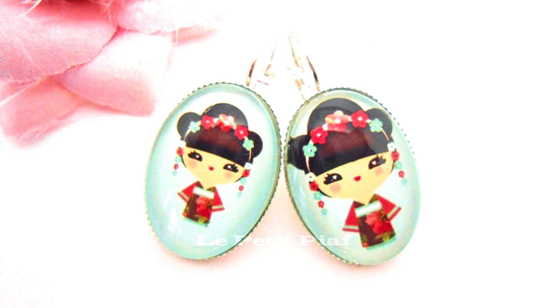 Support métal argenté avec son cabochon en verre, motif kokeshie.