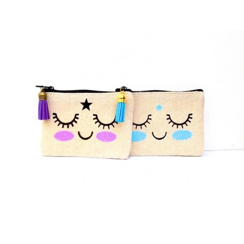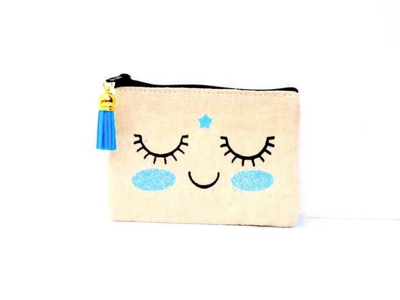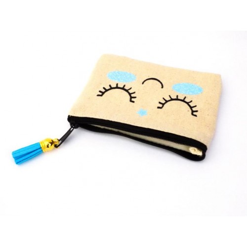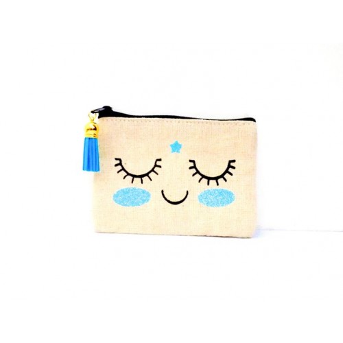 Magnifique pochette doublée, extérieur imprimé sourire et son bindi, intérieur tissu neutre blanc, agrémentée d'une breloque pompon turquoise sur le zip pour le côté fun !
